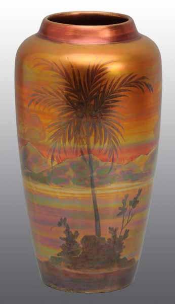 Description Coppertone color depicting palm trees and mountains. Unmarked with minor scratches. Condition (Excellent). Size 10" T.