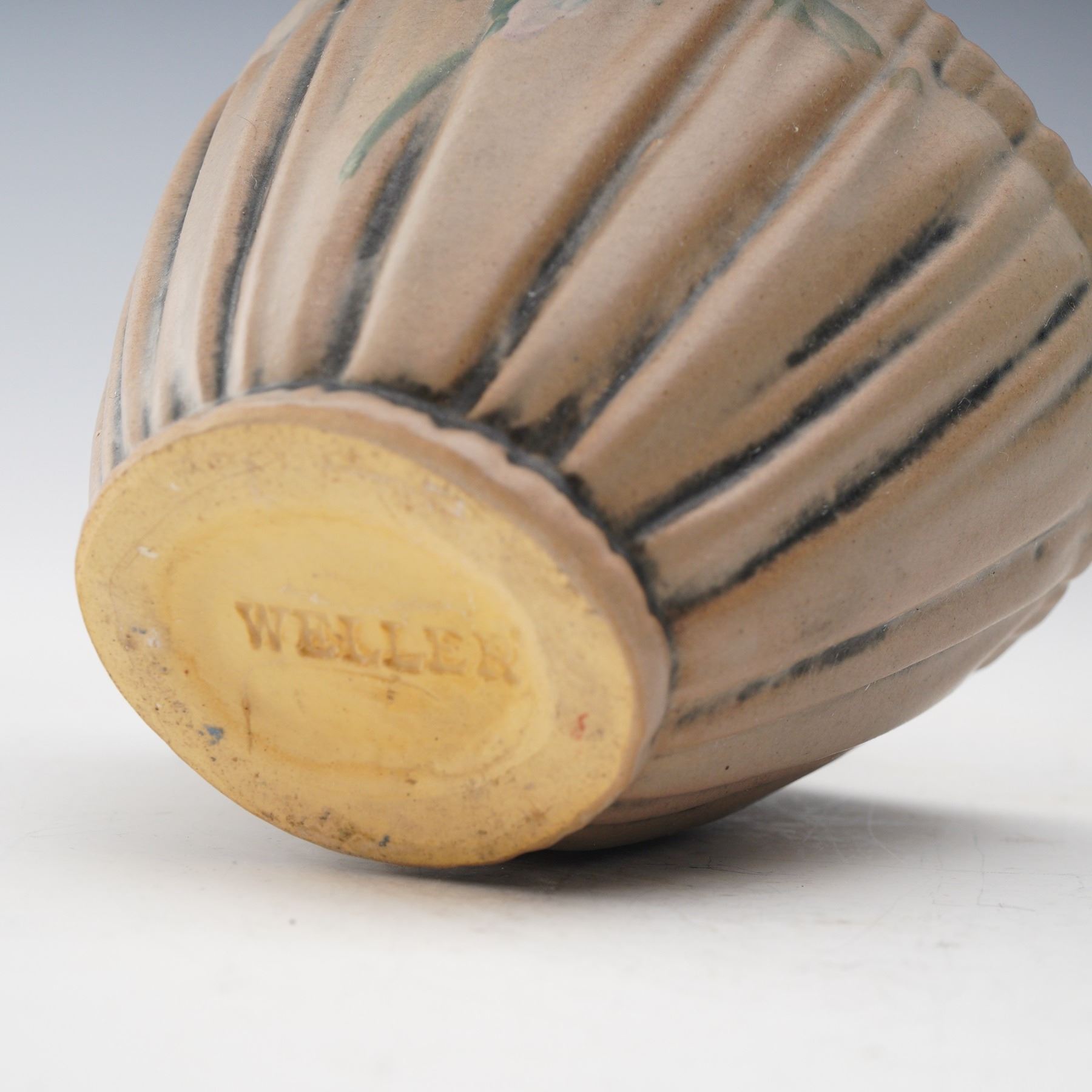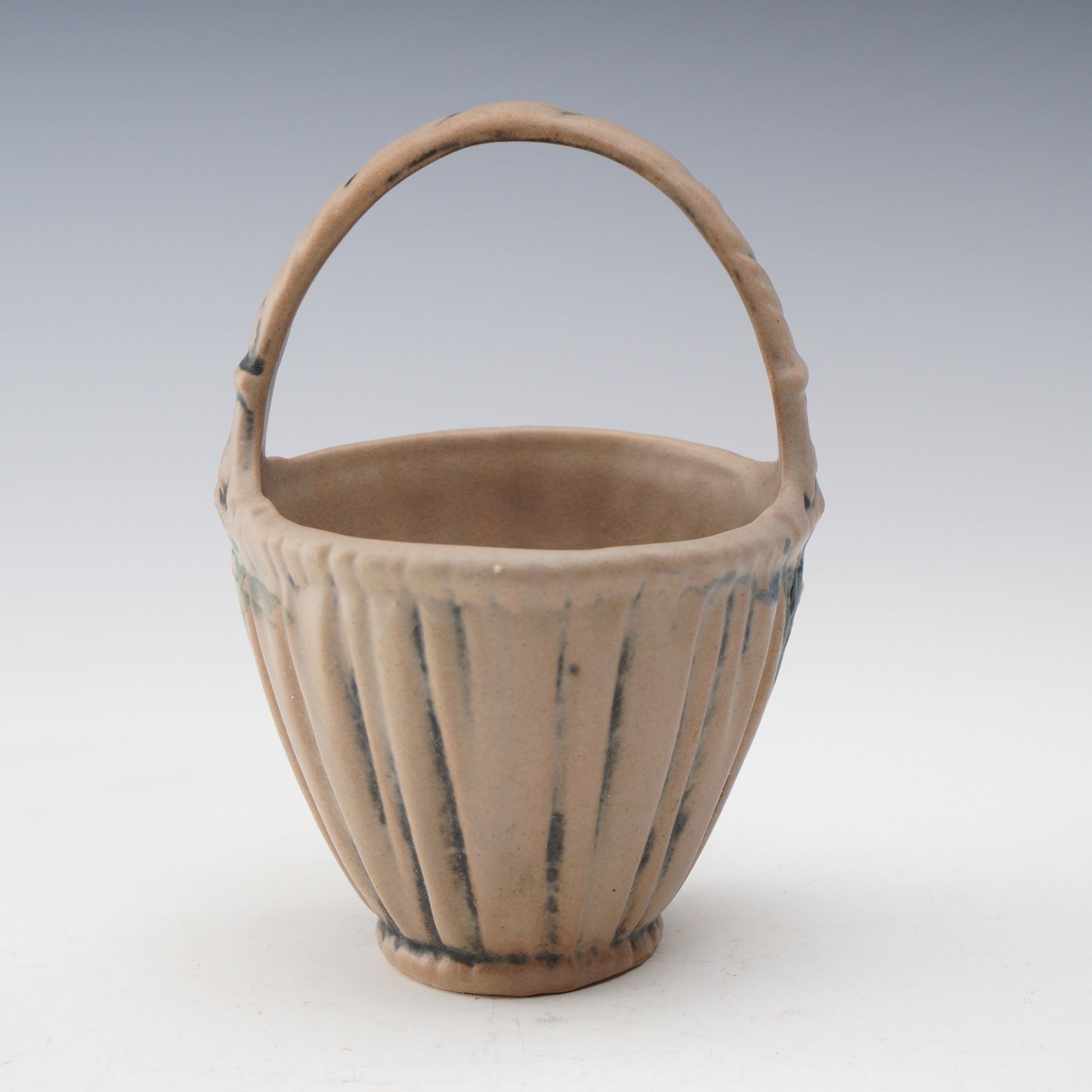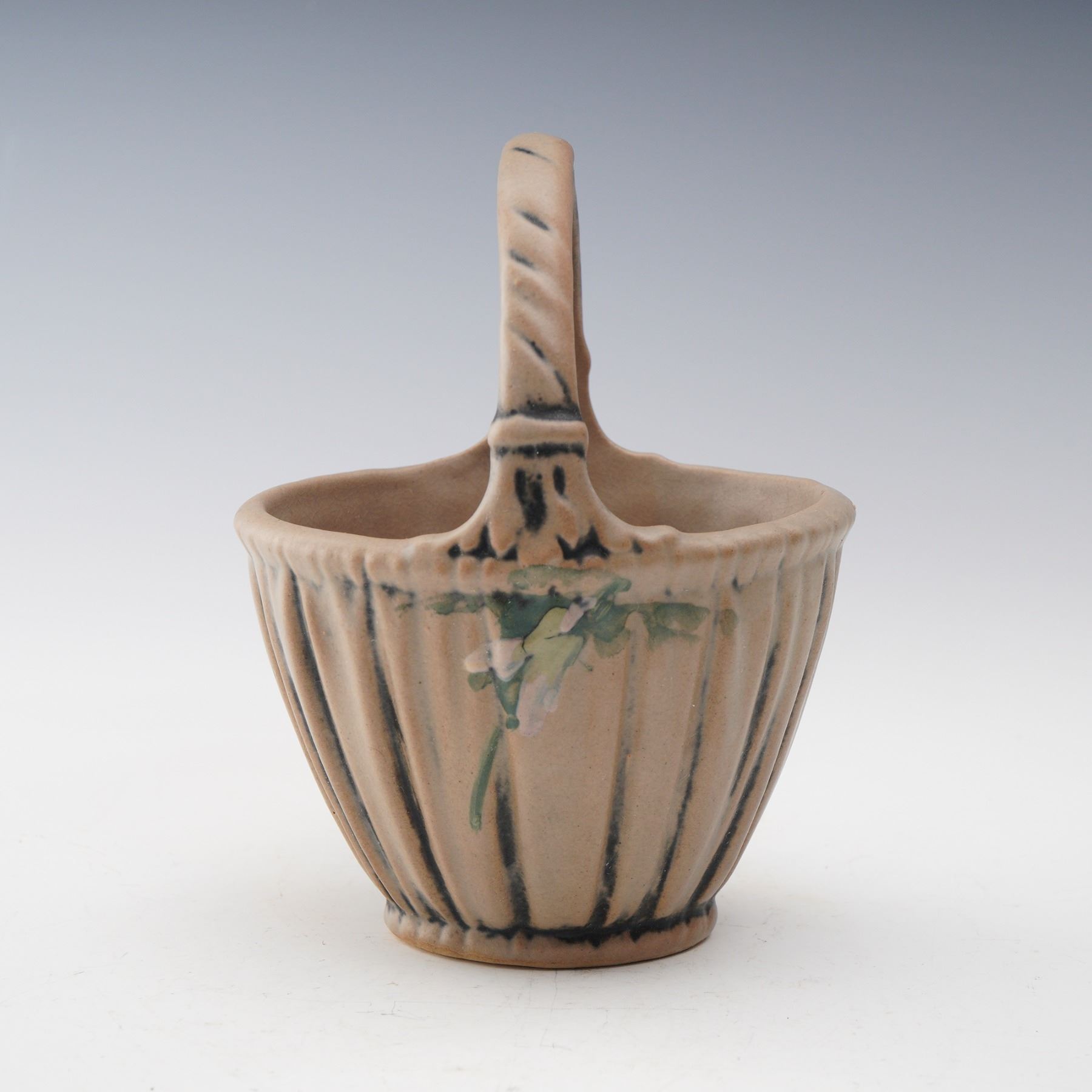 A charming Weller Pottery basket vase featuring a ribbed body with soft matte glaze and subtle hand-painted floral accents. The piece is formed with a graceful arched handle and displays the classic Arts and Crafts styling that Weller is celebrated for. The underside bears the impressed Weller mark, a hallmark of authenticity. A fine example of American art pottery craftsmanship that showcases Weller's dedication to form and function.
