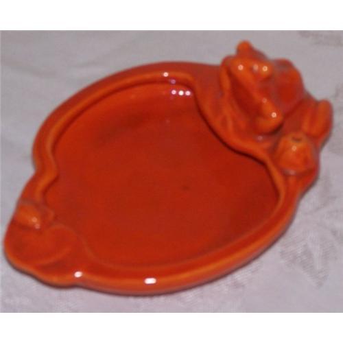 Unsigned Weller frog and lily pad ash tray or candy dish. Deep orange color. crazing to the glaze, no chips or cracks. Please see our other frogs.