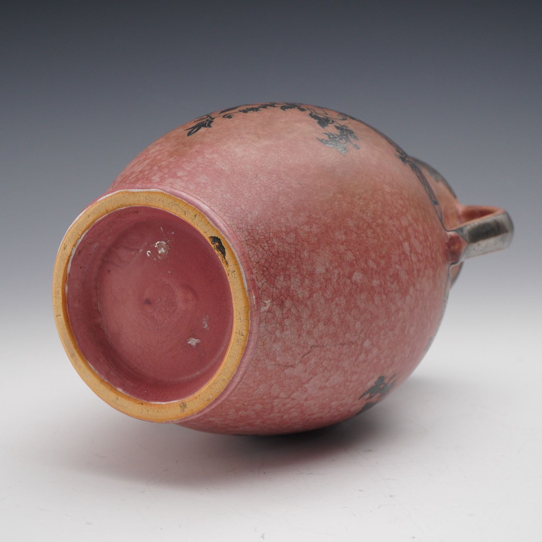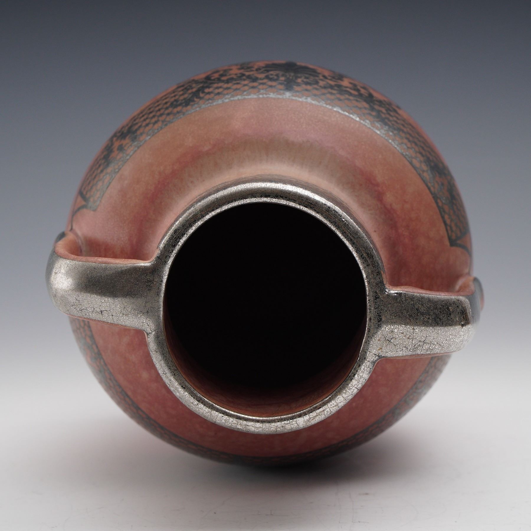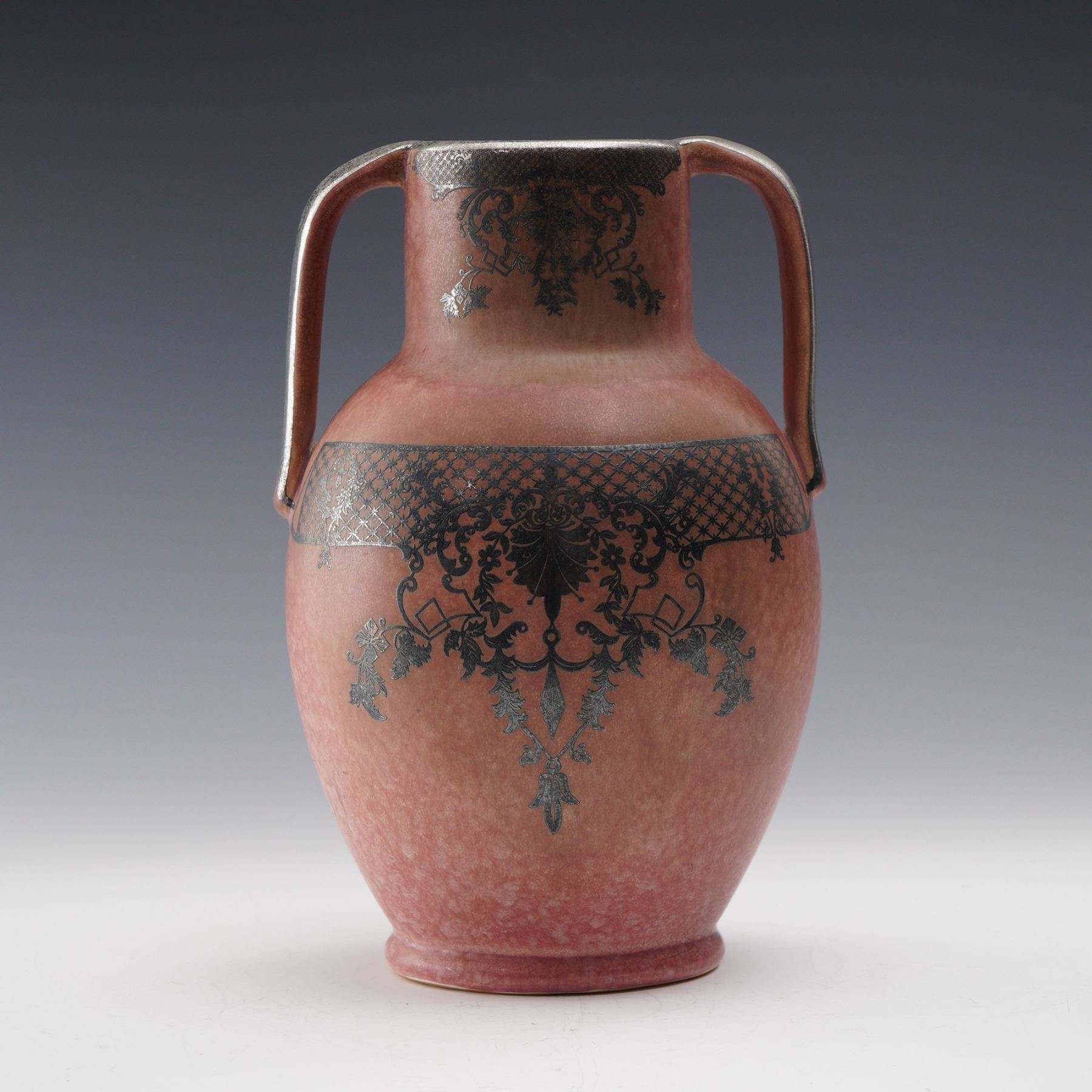 An impressive Weller Pottery vase featuring a mottled rose-pink glaze, enhanced with intricate silver overlay in a lattice and foliate motif. The elegant two-handled form showcases both the artistry of Weller's early 20th-century production and the fine craftsmanship of silver overlay decoration, which adds refinement and contrast to the rich ground. The body carries delicate surface crackling typical of age, further attesting to its authenticity and vintage character.