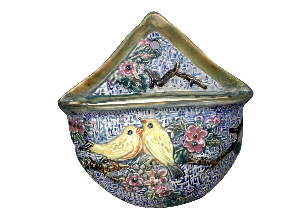 Weller Pottery Wall Pocket. Canary and apple blossom motif. Marked with both ink and embedded stamps. No chips or cracks, excellent condition. 7 X 7 X 2 inches.