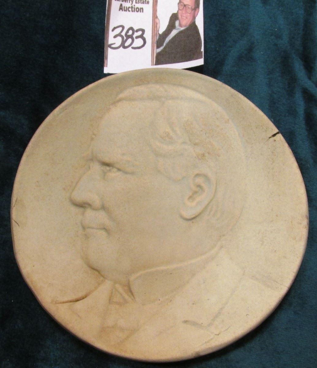 Weller Pottery of President Mc Kinley. Circa: 1904. William McKinley, the 25th President of the United States, is the subject of this pottery plaque made by Weller Pottery. He was President from 1897-1901. The political plaque, which really looks like a small dish, measures 4 1/2" in diameter. Weller Pottery was in business from 1872 - 1948, in Zanesville, Ohio. These plaques were said to have been made for the St. Louis World's Fair, circa 1904. In very nice condition. Impressed Weller on the back.