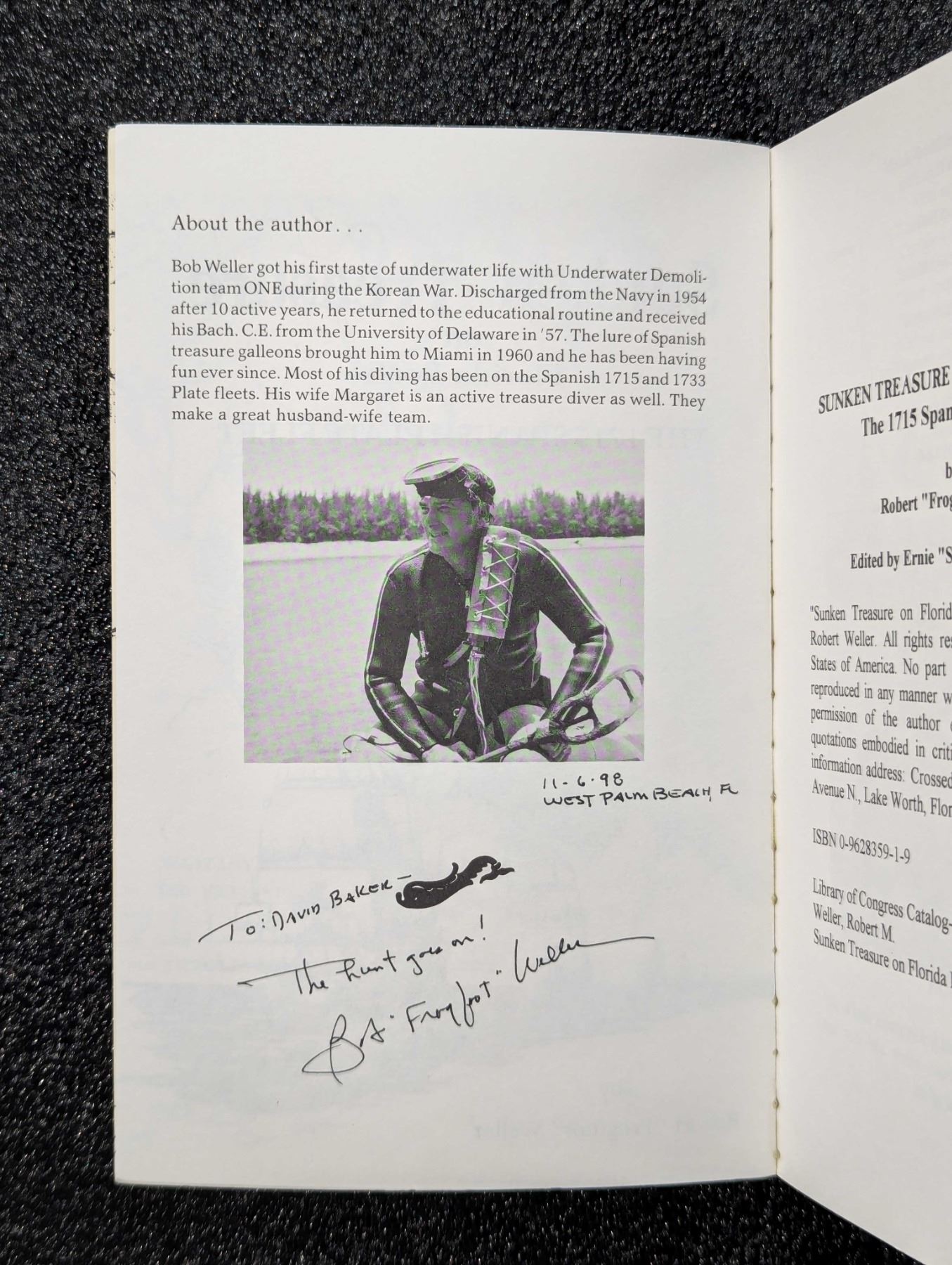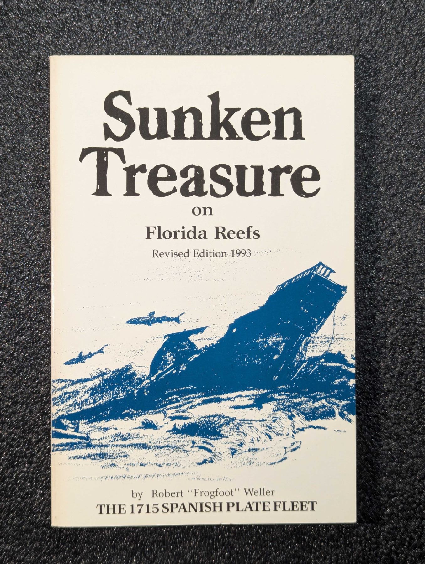 Weller, Robert 'Frogfoot'. SUNKEN TREASURE ON FLORIDA REEFS. Crossed Anchors Salvage, Lake Worth. 1993. 12mo. (2), 158 pages. Original printed card covers. Inscribed by the author to David Baker. Revised and expanded edition. Maps. Diagrams. Bibliography. b&w and color historical, coin, antiquities and wreck photos throughout. English text. The David Baker Library. Fine. This is probably the best book that has been written about the 1715 Spanish treasure fleet, which sank off of the east coast of Florida in a hurricane. It includes the history of the fleet, its demise, and the subsequent salvage efforts (both by the early Spanish salvors and by modern salvors). The author is one of the most successful salvors of the 1715 Fleet wrecks. Lot weight: 0 lbs 9oz. Subject(s): Sunken Treasure.