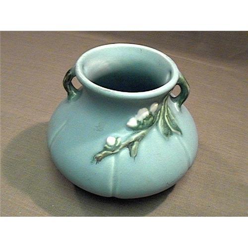 This lovely matte blue vase measures 4 1/2? tall. The green flowers wrap up to the handles. The Bouquet Line of Weller Pottery was developed by Dorothy England Laughead in the mid 1930s and consisted of pieces with molded daffodils, dogwood, or lilies of the valley on a tan, green, blue or white background, with white being harder to find. It is marked Weller Pottery F-2 in cursive letters. Injury free, no chips, nicks or cracks.