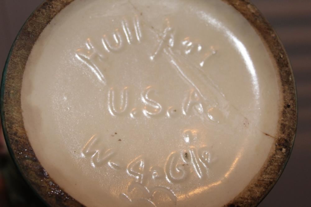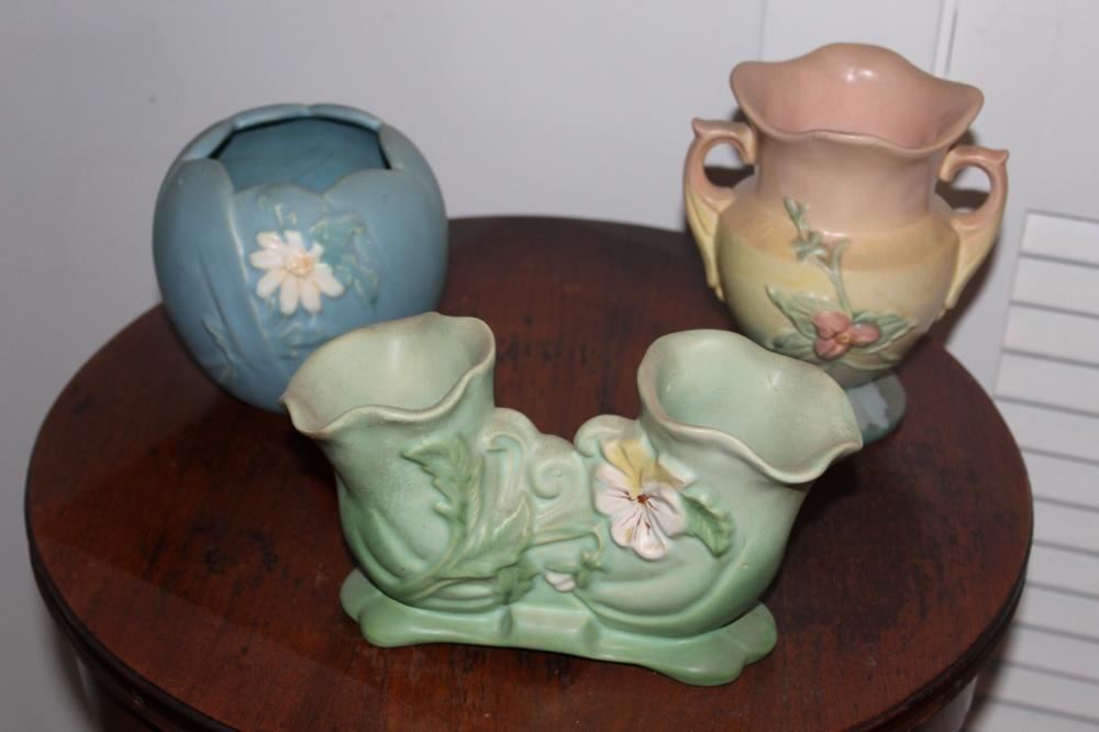 Weller double vase, Weller blue vase and Hull double handled vase (has some glazing loss). Tallest measures approx. 6.5 inches tall