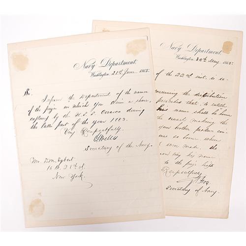 <Our item number 136851><B>Welles, Gideon & Gustavus V. Fox.</B> Letter Signed ("G. Welles") as Secretary of the Navy, on official letterhead, 1p, 10x8 inches, Washington, 21 June 1865. To Mr. D.M. Egbert, asking for "the names of the prizes in which you claim a share, captured by the U.S.S. Owasco during the latter part of the year 1863." With a related letter signed ("G.A. Fox") as Acting Secretary of the Navy. Both fine; glue residue in corners; both affixed at top to another page. The U.S.S. Owasco operated on the Mississippi during the bombardments of New Orleans and Vicksburg, then served along the Texas coast; she helped capture or destroy ten sailing vessels between May 1863 and April 1864. <BR>Estimated Value $150 - 200. <BR><BR>Our item number 136851<BR><IMAGES><P ALIGN="CENTER"><IMG SRC="http://www.goldbergcoins.net/liveauction/49jpegs/136851.jpg"> </P></IMAGES>