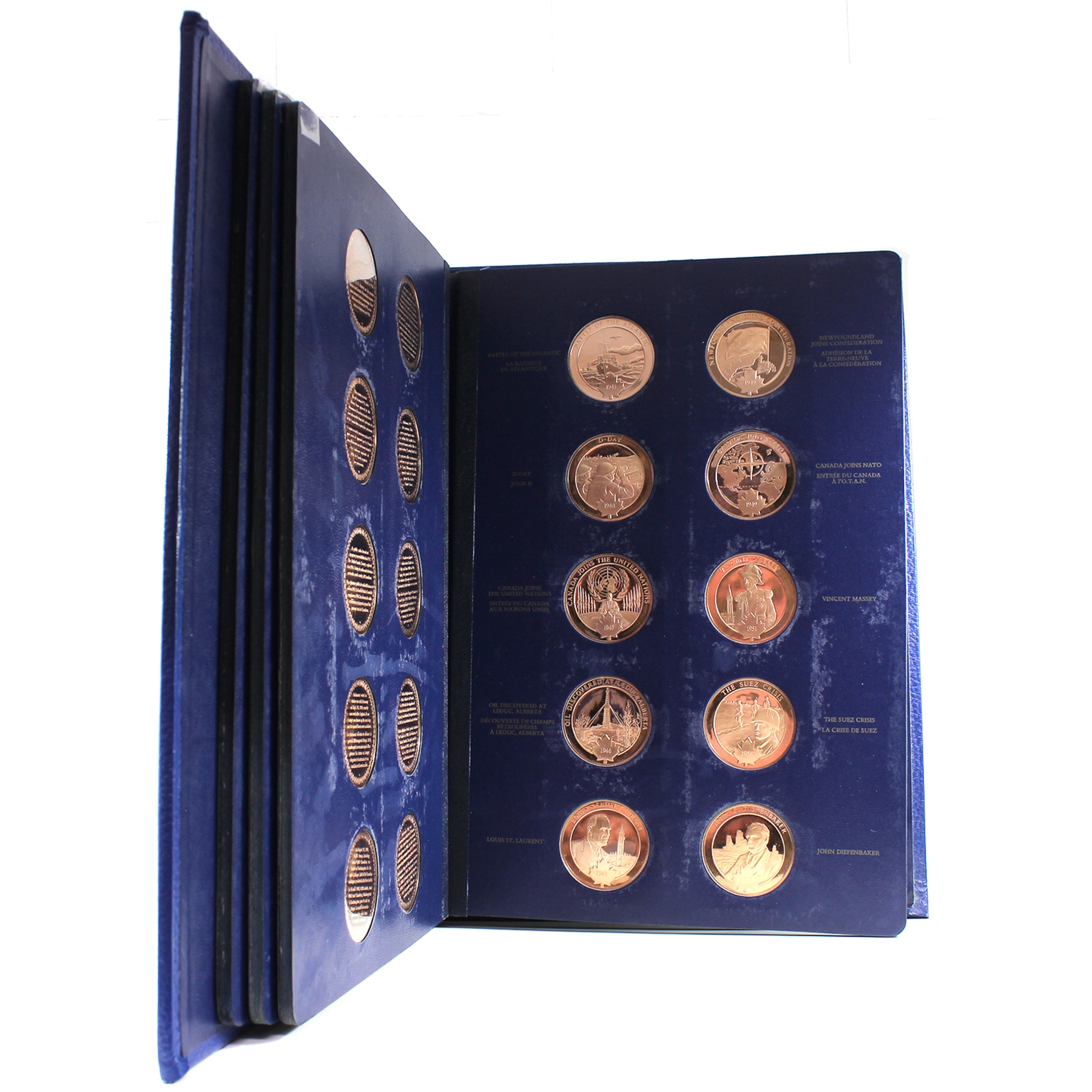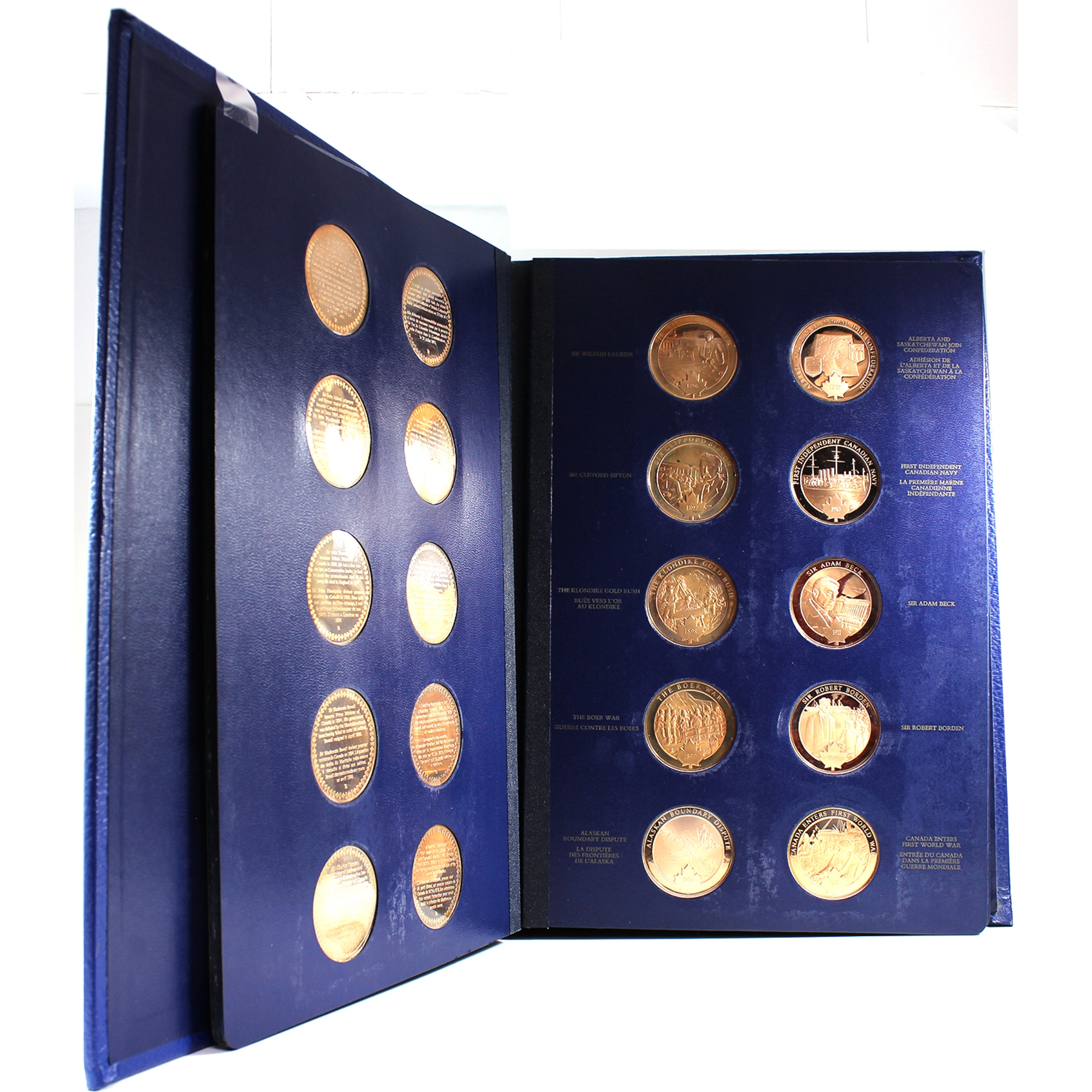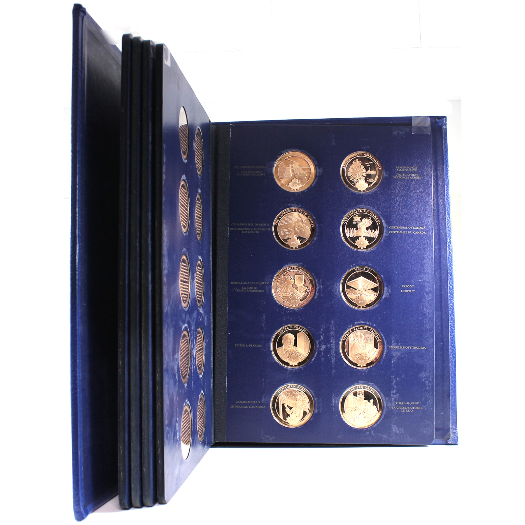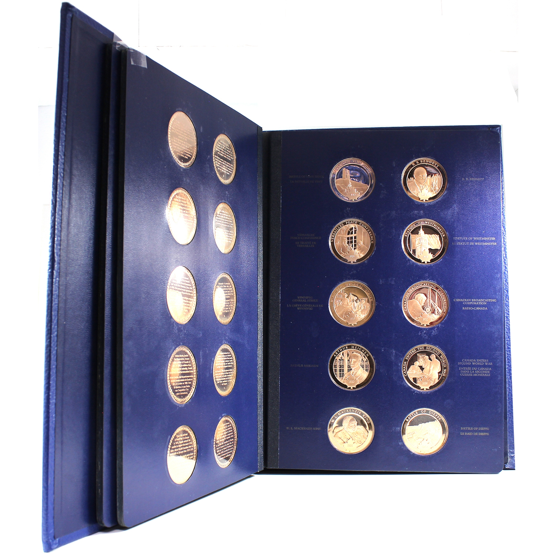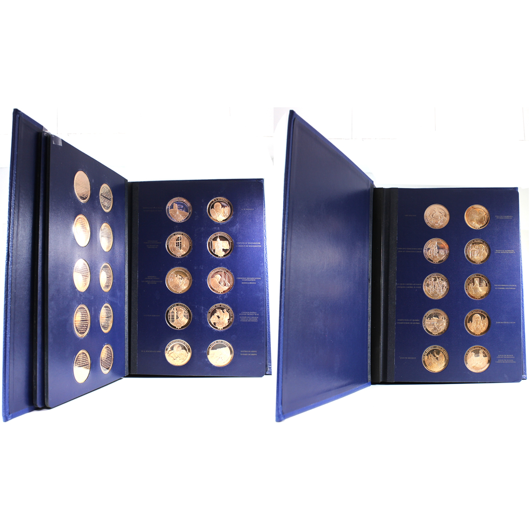 This beautiful collection includes 100 proof bronze medallions (50 per volume) in collector albums. Most of the medals are accompanied by an information pamphlet (84 in total). This extraordinary series of 100 medals Commemorating Canada’s history is the first medallic history of Canada series ever produced. This collection would also be a great asset to Canadian history teachers, or for school libraries. Medals have some toning. Very minimal age related wear to albums and creasing/dents to cardboard box.
