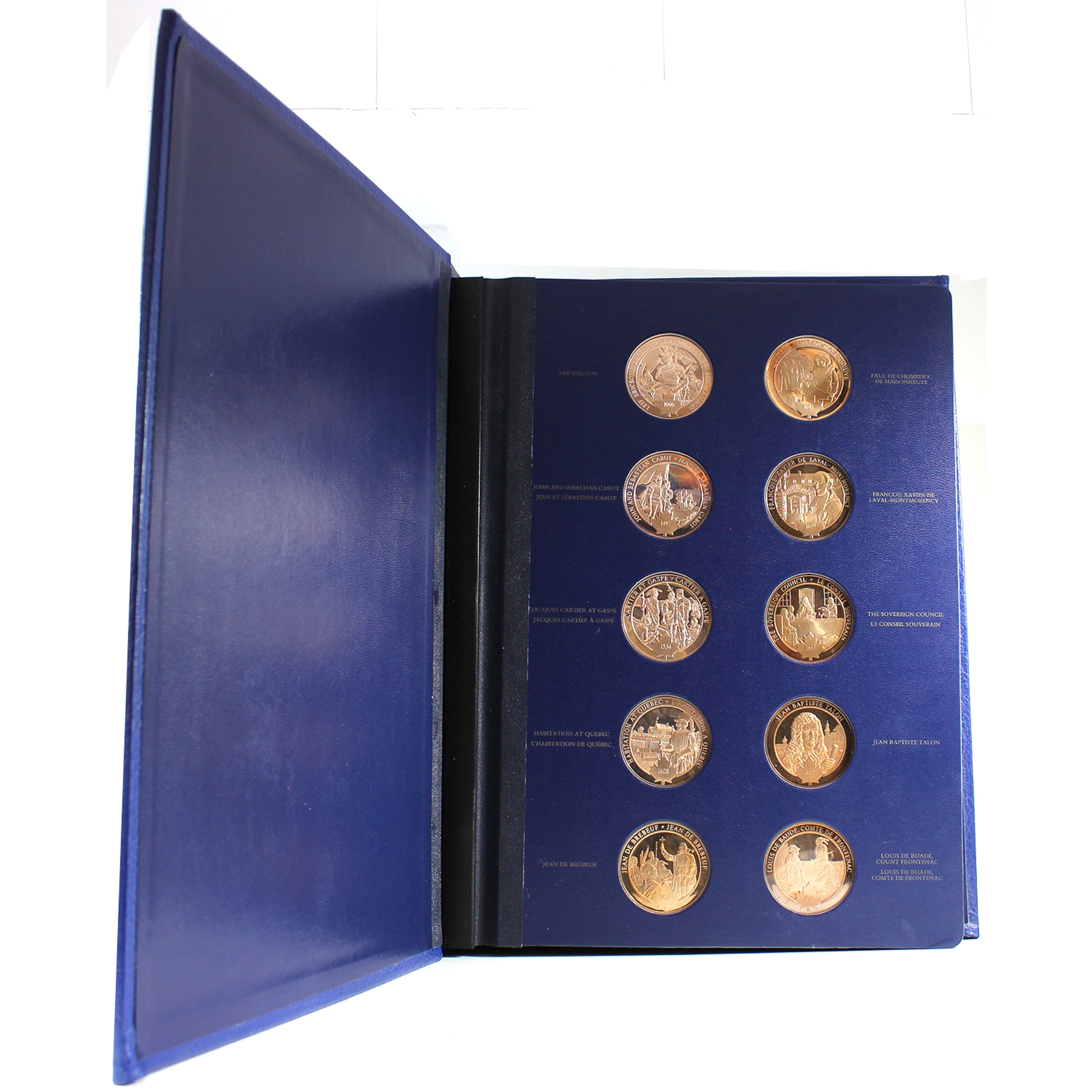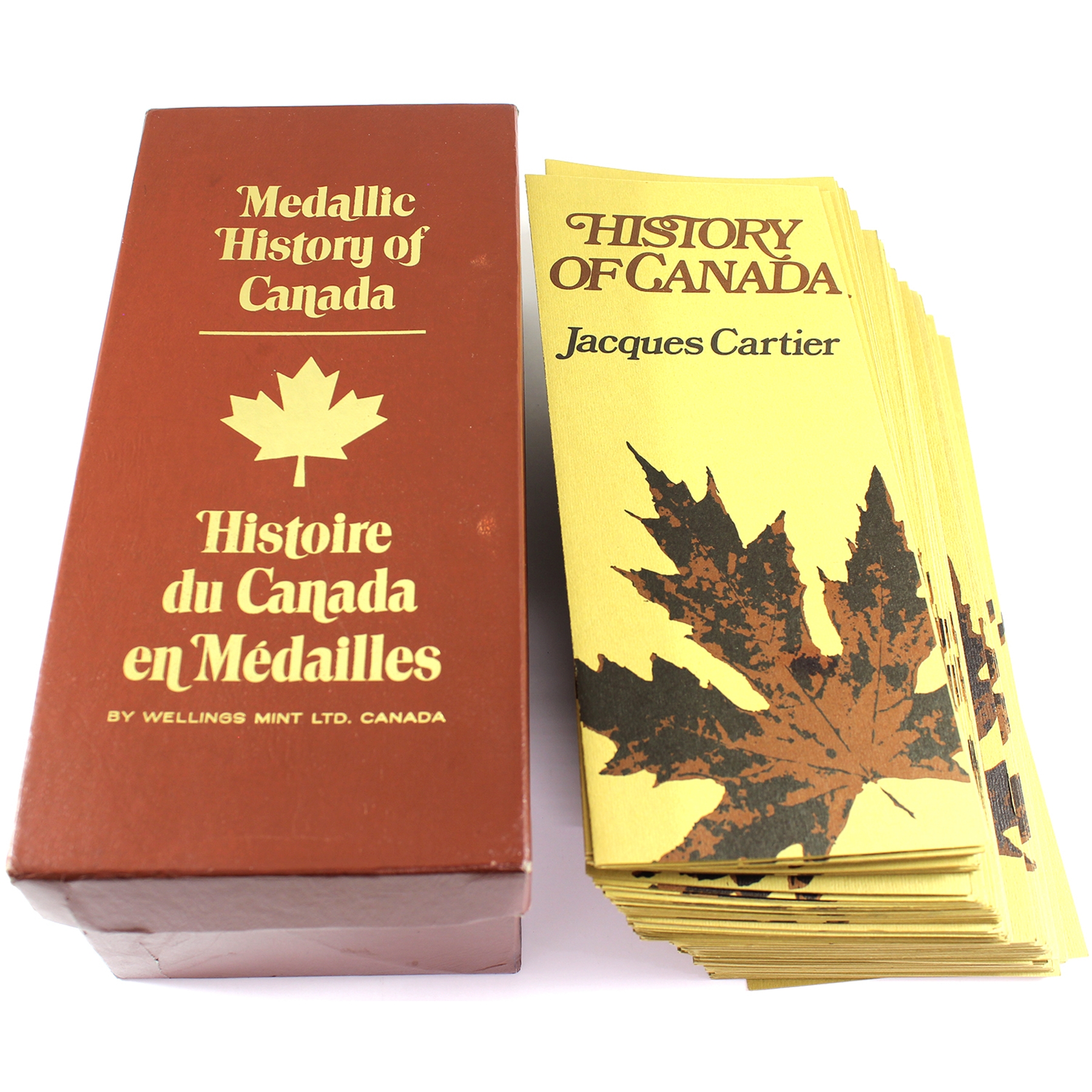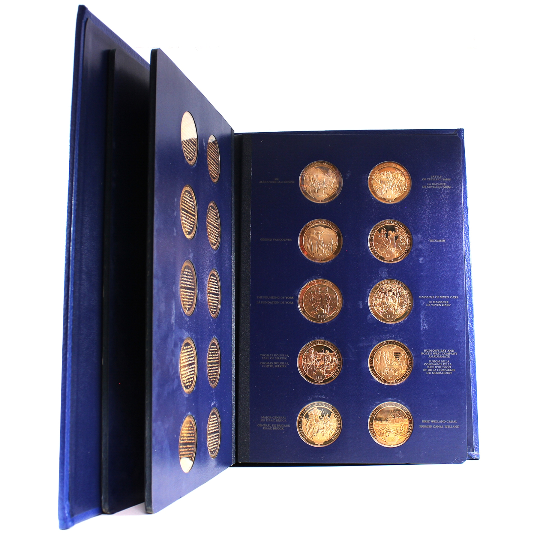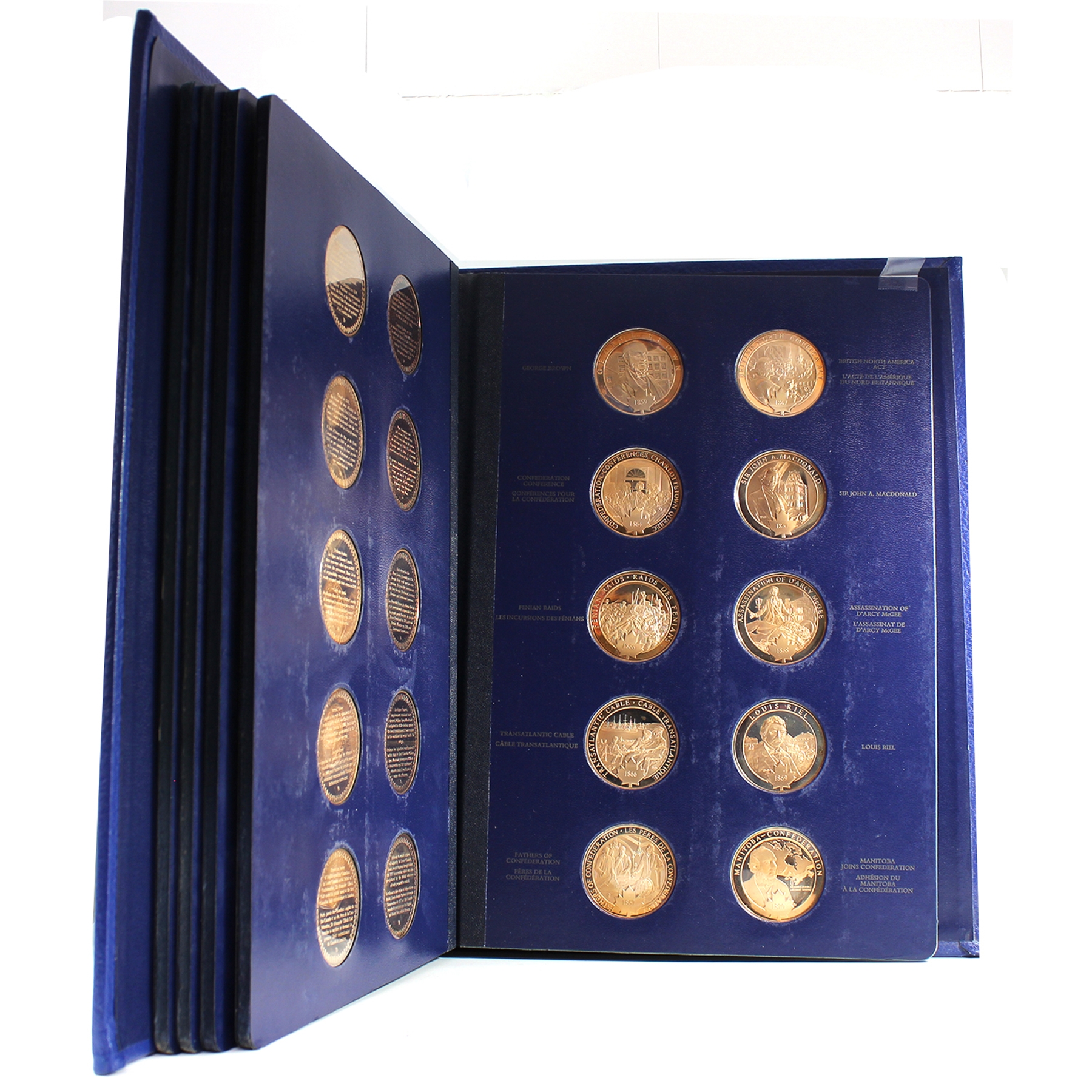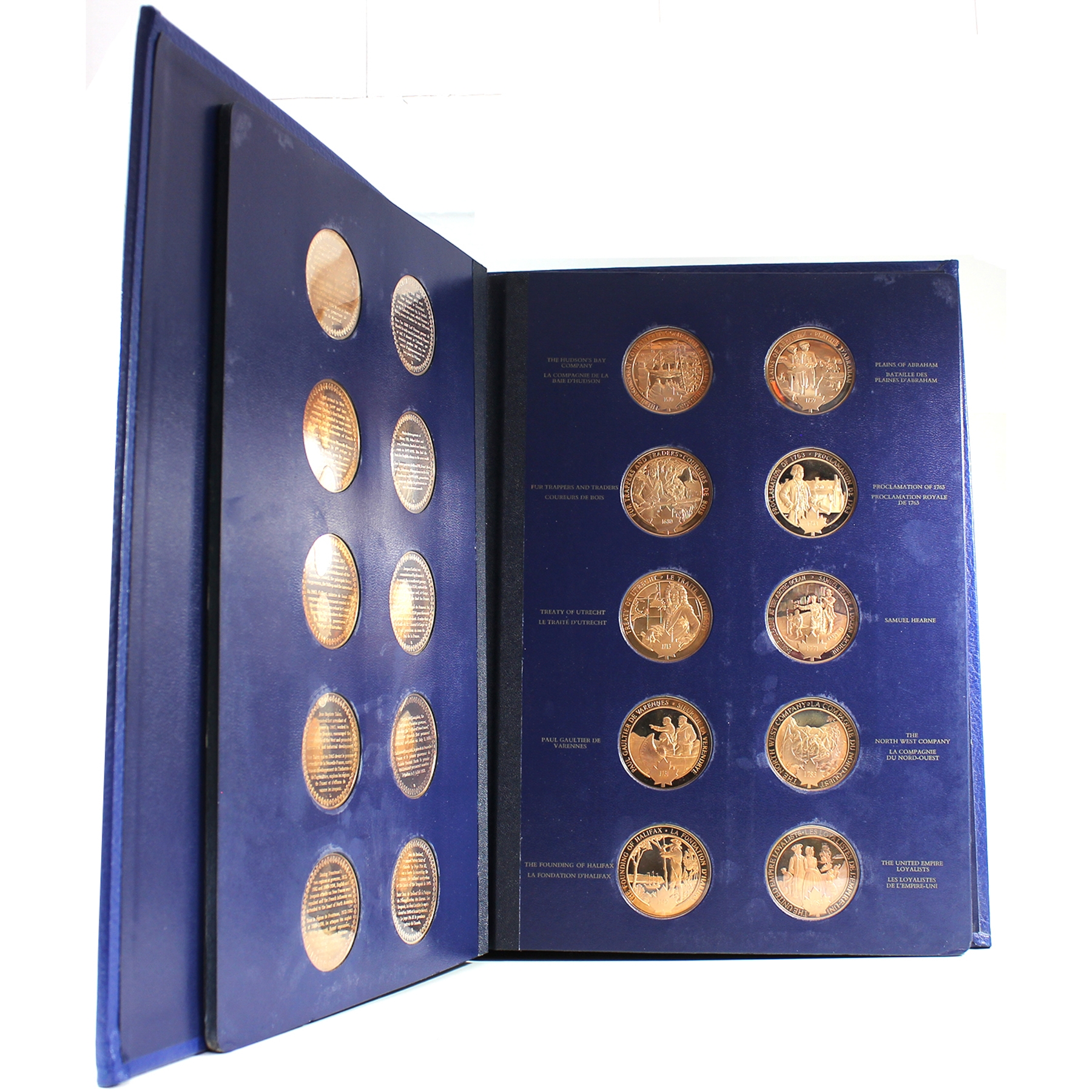 This beautiful collection includes 100 proof bronze medallions (50 per volume) in collector albums. Most of the medals are accompanied by an information pamphlet (84 in total). This extraordinary series of 100 medals Commemorating Canada’s history is the first medallic history of Canada series ever produced. This collection would also be a great asset to Canadian history teachers, or for school libraries. Medals have some toning. Very minimal age related wear to albums and creasing/dents to cardboard box.