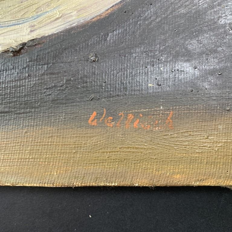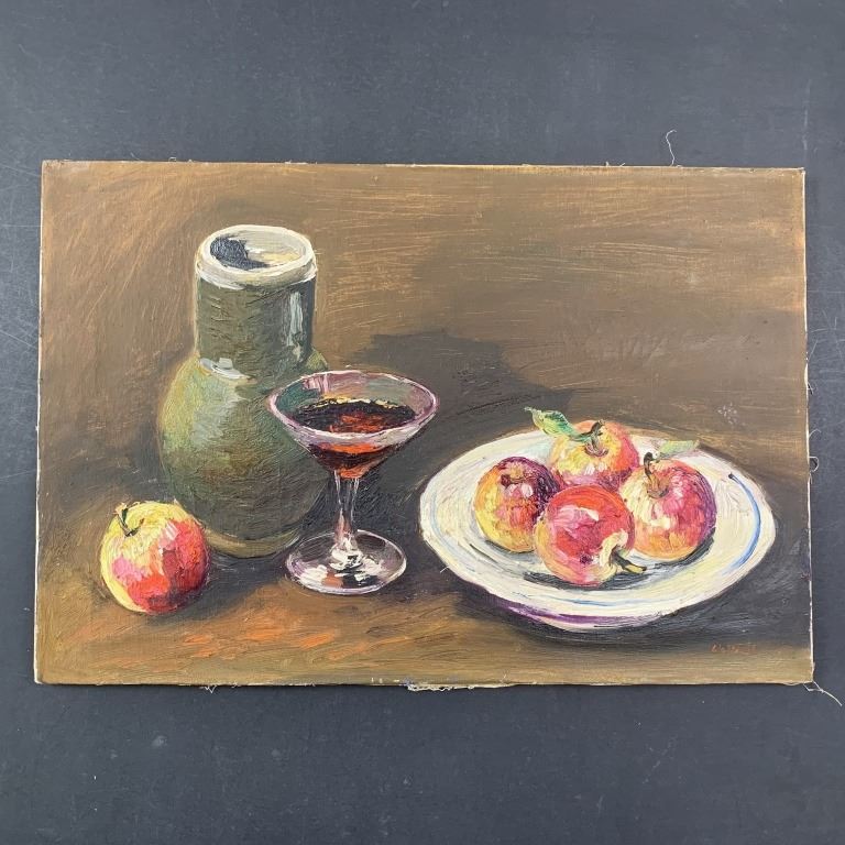Wellisch, Untitled, Original on Canvas. A fruit bowl with some apples, a vase and a glass of red wine. This piece is in good condition