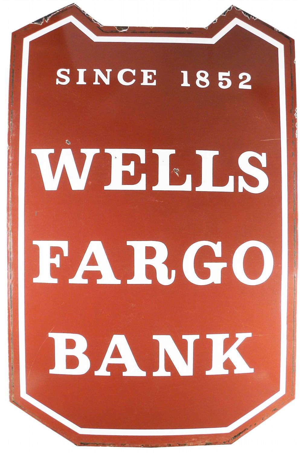 Wells Fargo Bank Porcelain Die Cut Sign. Chips around edges, two chips above "Wells" otherwise good condition. 36 X 55 inches.