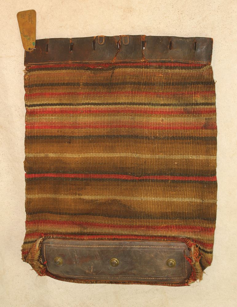 Unique original large messengers Wells Fargo depot carpet bag, with a fantastic brass bank tag stating "Nevada State Bank". In fair condition with the top edge being tattered. Dimensions 22"x 18".