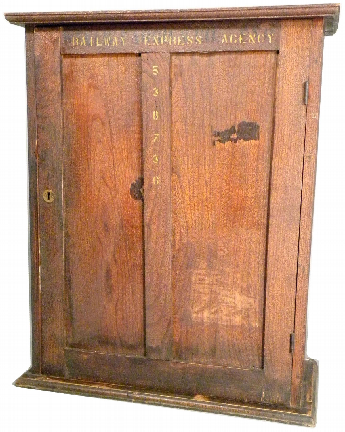 Wells Fargo & Co. Express Cabinet. Over stamped by Railway Express Agency when all Express companies were purchased. Tin tag on side"A.R.E. 538736". Complete interior and original finish. Very good condition. 24 X 29 1/2 X 11 3/4 inches.
