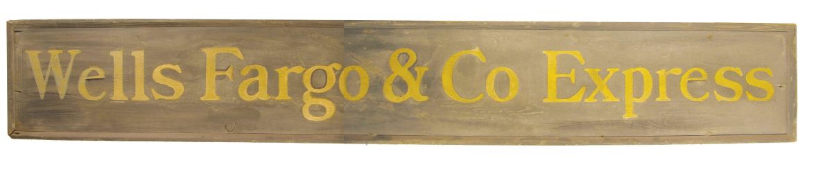 Wells Fargo & Co. Express and American Railway Express, two sided Painted Wood Sign. Possible repaint on letter to the Wells Fargo side good original condition on the Railway side. 71 3/4 X 11 inches.
