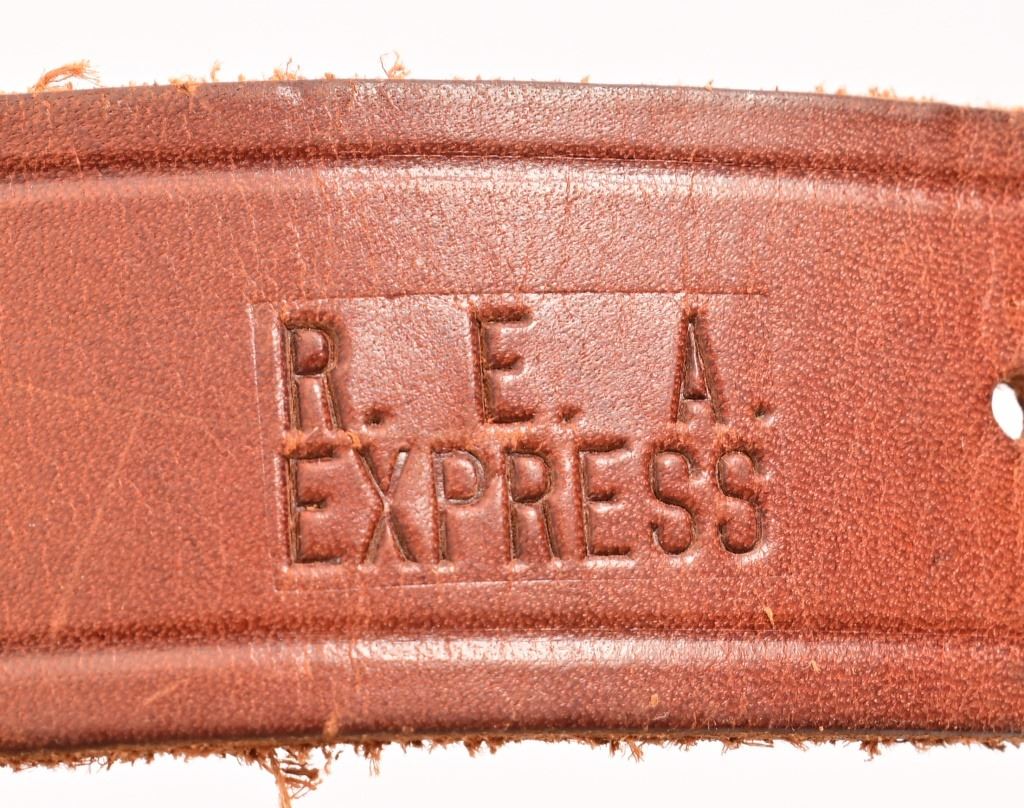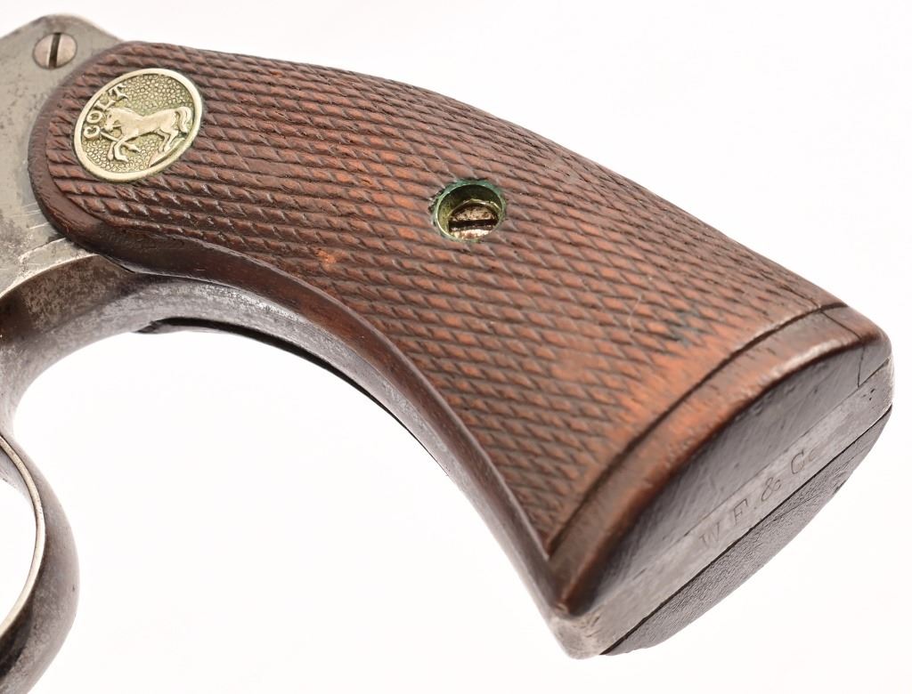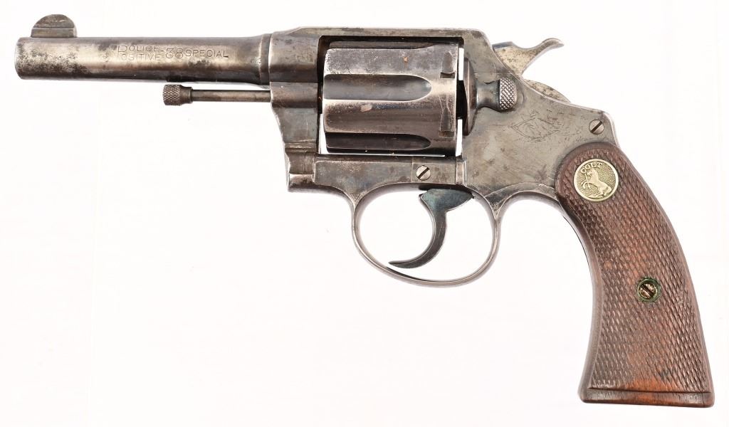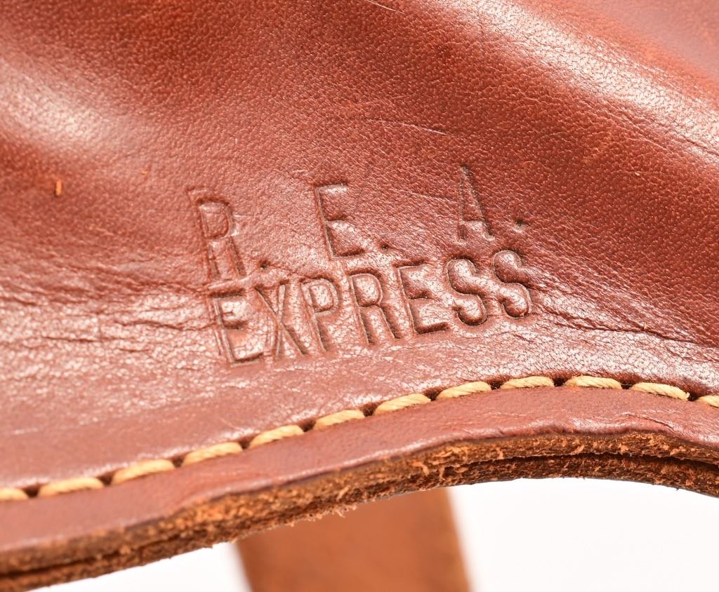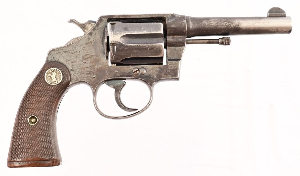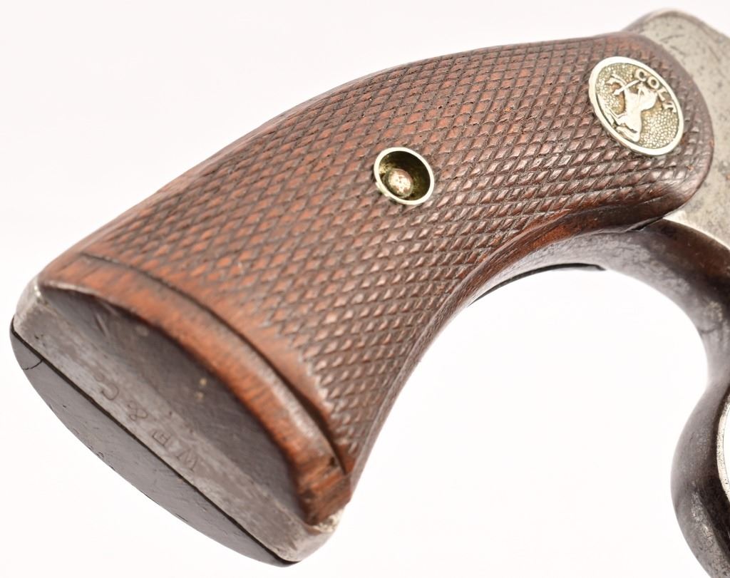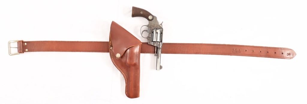 4" barrel, checkered wood Rampant Colt grips. S/N 58234, manufactured 1912. With leather holster belt rig marked "R.E.A. Express" on holster, belt loop is stamped "304.5".