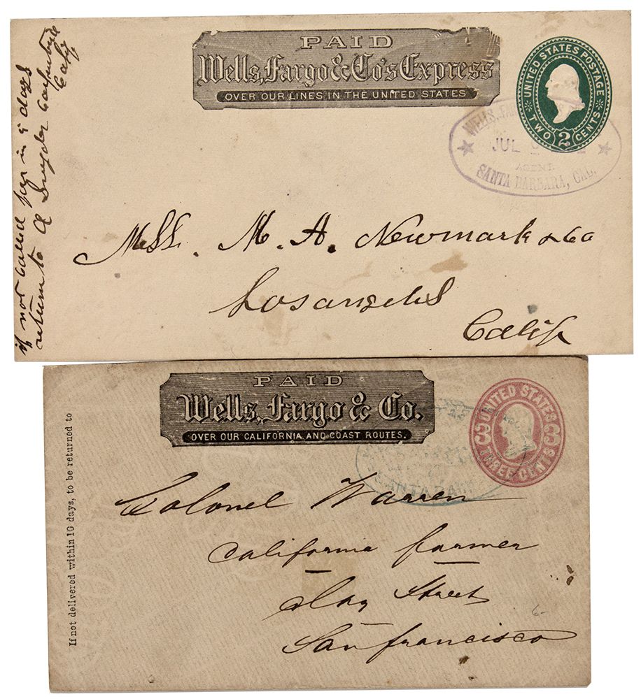 c1894 Wells Fargo "Franked" Express covers. The covers feature the oval W-F Express cancellation stamp. The LA addressed stamped cover is from the W. Tatham collection, and has a second W-F round stamp on the reverse with a date of July 7, 1894. There are no postal cancellation stamps. Both are in very good condition. - HKA#64074