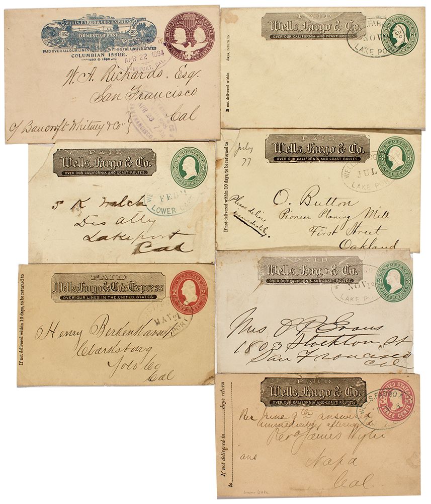 c1894 Wells Fargo "Franked" Express covers. The 7 covers feature the oval W-F Express cancellation stamp, in both blue and black ink. 1 of these is an earlier version of the W-F frank, indicated as the "Columbian Issue 1852 1892," stamped, with vignettes of Pony Express, a Train and a Stage Coach. This specific cover also features the USPS "Columbus Centennial" postage stamp. (Please note that this cover has the corner on the reverse repaired.) None of these bears any USPS cancellation/ postmark stamps. - HKA#64076