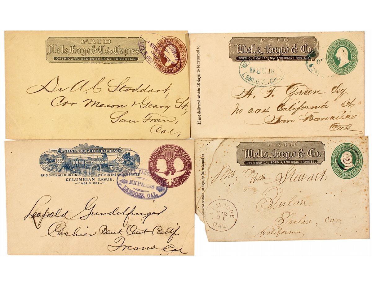c1876 Wells Fargo "Franked" Express cover, from the farming and railroad town of Lemoore. These covers features the oval W-F Express cancellation stamp, in blue and green ink. 1 of these is an earlier version of the W-F frank, indicated as the "Columbian Issue 1852 1892," stamped, with vignettes of Pony Express, a Train and a Stage Coach. This specific cover also features the USPS "Columbus Centennial" postage stamp. There is a USPS cancellation/ postmark stamp on 1 cover addressed to Mrs. W. Stewart, Tulare Co. The "California Town Postmarks" book by J.H. Williams lists this as TUL-1550, rarity 3. (Please note that this cover has a torn corner on the left side.) Lemoore was transferred from Tulare county to Kings in 1893 by state legislation to slit Tulare into 2 areas. Good condition, rare. - HKA#64083