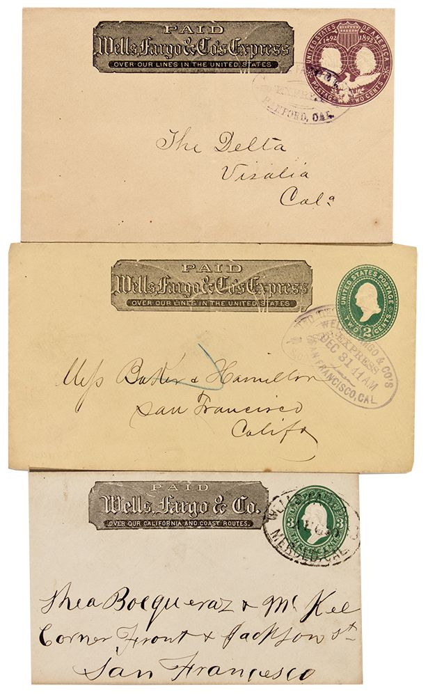 c1900 Wells Fargo "Franked" Express covers. The covers feature the oval W-F Express cancellation stamp. The Merced stamped cover is from the W. Tatham collection. One of the Hanford covers, addressed to Visalia, has the rare "Columbus Centennial" stamp from the USPS. There are no postal cancellation stamps. All 3 are in very good to excellent condition. - HKA#64073