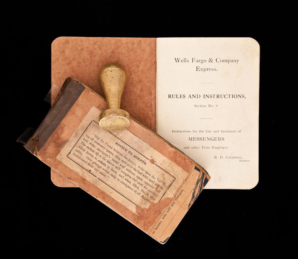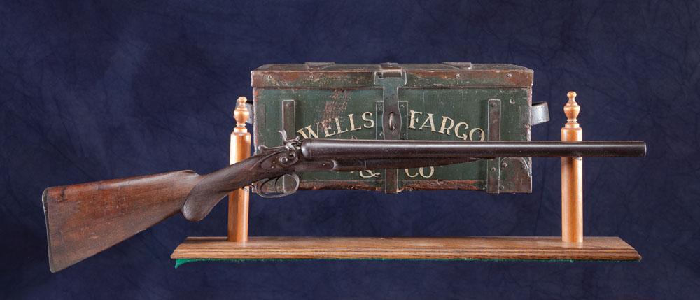 Colt’s Pt F.A. Mfg.Co. 10 gauge hammer gun with 20” barrel. Sideplate marked W.F. Co. #854 on barrel, stock stamped Wells Fargo & Co. also scratched into stock. Comes with decorative Treasure Box reproduced to represent the original, an original agent’s receipt book, agent’s rule book and brass Wells Fargo & Co. stamp.