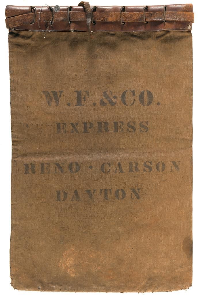 Likely a late production canvas and leather bag that measures 17 1/4" wide by 26 1/2" tall. It is stenciled "W F & CO/EXPRESS/RENO-CARSON/DAYTON". Good showing typical wear for its age.