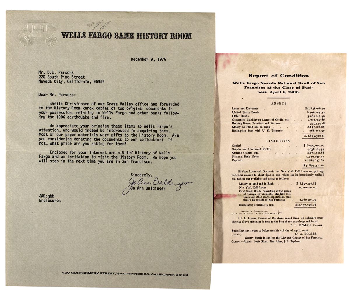 This is a financial report from the company two weeks prior to the earthquake and fire that devastated the City. At the time, the bank was showing an available cash total of over $20 million. The piece is accompanied by a letter from the bank historian, showing their interest in the document. - Jacobitz Collection -60459