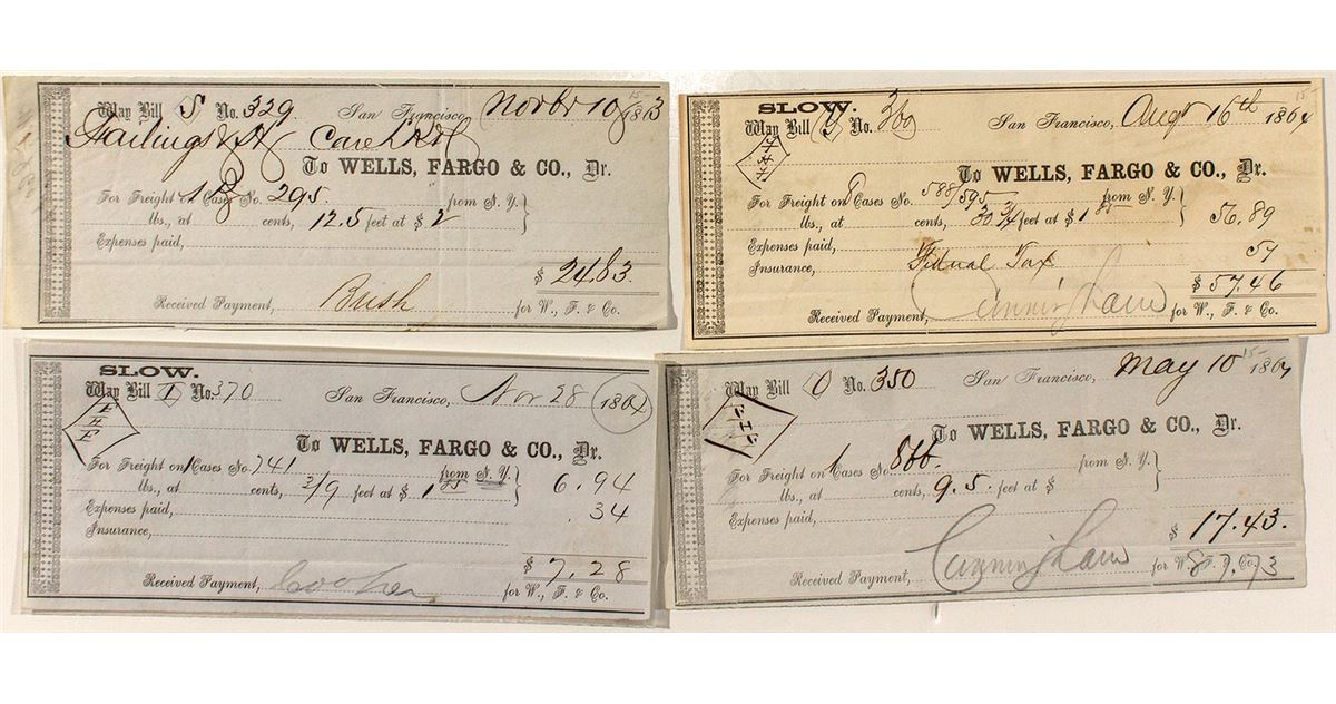 Two SLOW Way Bills (both 1864) for freight on cases from New York. Each measures 3.25" x 7.5." Also two other way bills (1863 and 1864) that measure 3" x 8." All have the San Francisco dateline. Folds and light soiling. (Prag Collection)