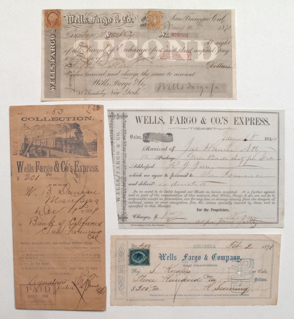 Four Wells Fargo pieces. 1) 1871 Second Exchange #370507 to James Cross. Orange brown 2c and orange 4c stamps attached. 2) 1864 receipt of James Haun(?) for greenbacks to be delivered as directed. 3) 1878 Columbia check to S Knapp signed by H Sevening. Two cent blue stamp attached. 4) 1899 collection envelope from W. B. Duncan. City: County: State: CA