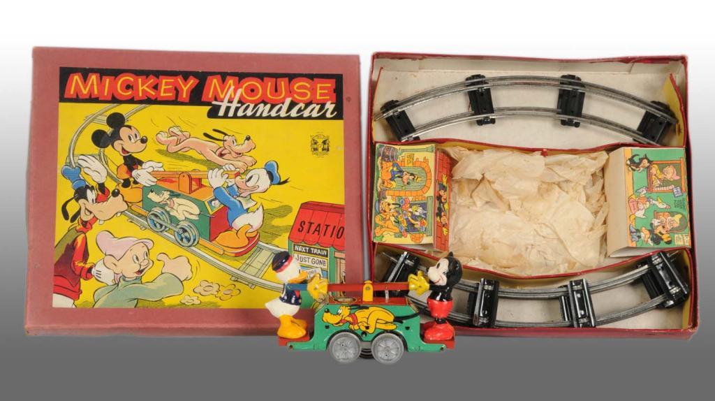 Pre-war. English. Includes crisp original box, original inserts, and original track and key. Handcar is working. Scarce item in excellent plus to like new all original condition showing very little playwear. Box is in like new condition and complete.