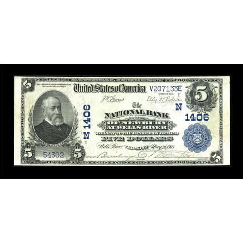 <B>Wells River, VT</B></I> - $5 1902 Plain Back Fr. 598 <B>The NB of Newbury</B></I> Ch. # (N)1406<BR> Bold stamped signatures remain on this bright note that carries the town name in the tombstone. <B>Very Fine-Extremely Fine</B></I>. <BR><BR><b>Shipping:</b> Coins & Currency (<a target="_blank" href="http://www.heritageauctions.com/common/shipping.php">view shipping information</a>)