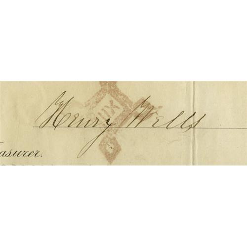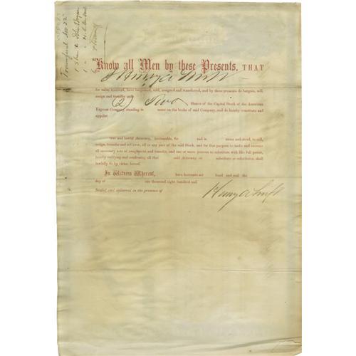 <B>Henry Wells Document Signed</B></I> , "<I> Henry Wells</B></I>". American Express Company stock certificate for 8 shares made out to Henry A. Smith , 12.0" x 8.25", New York, November 7, 1864. This scarce early certificate is signed by Wells as President of the company, which he founded in 1850. An attractive certificate with a large central vignette showing commercial scenes flanking a medallion on which reclines a watchdog. Signatures somewhat faded, slight browning and small split on lower right corner. Very Good condition.