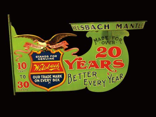 Very Rare Welsbach Mantels Tin Flange Sign with Tray. One side in excellent condition the other side is partially faded. 21 X 12 sign and 12 inch dia tray.