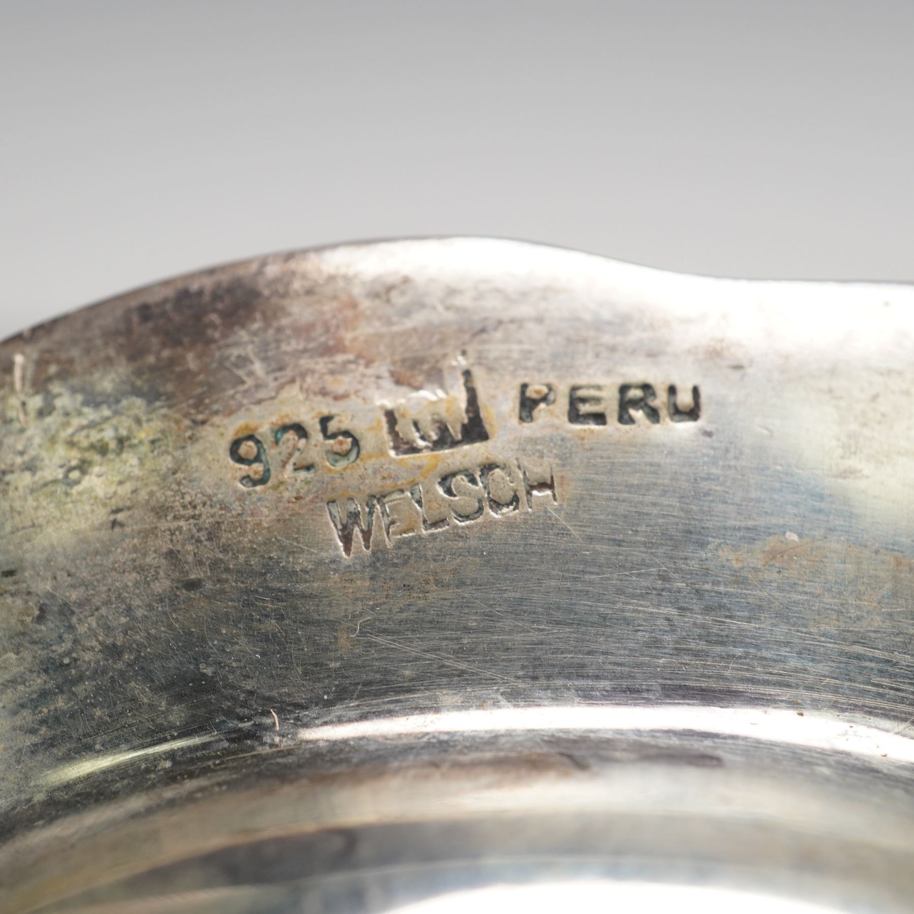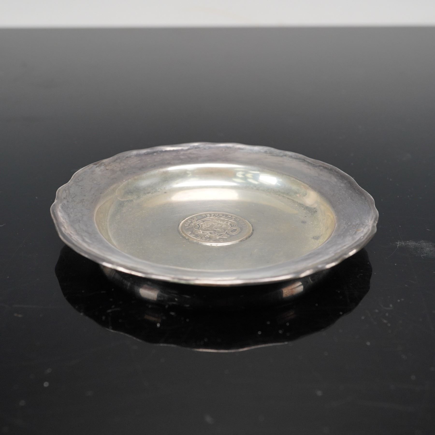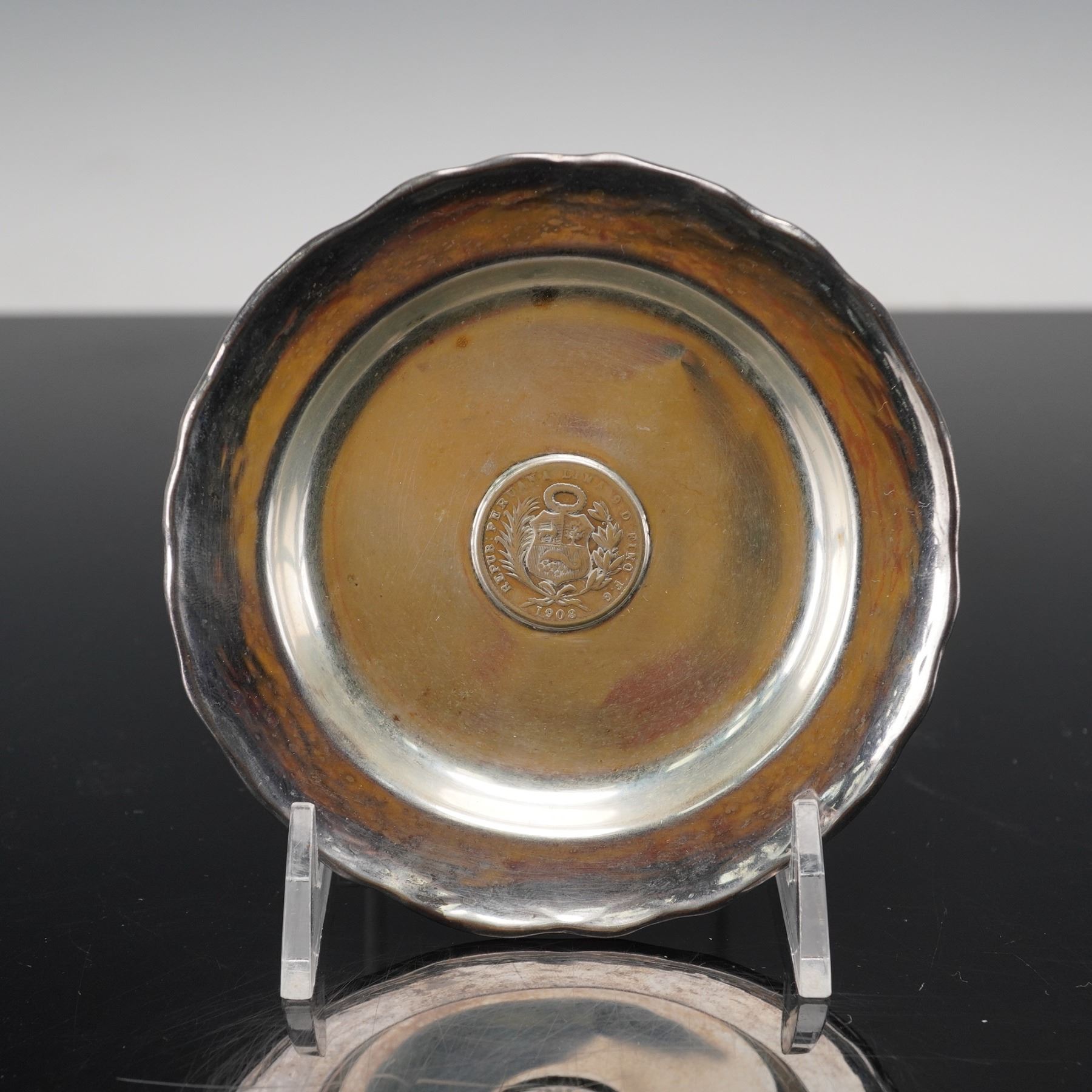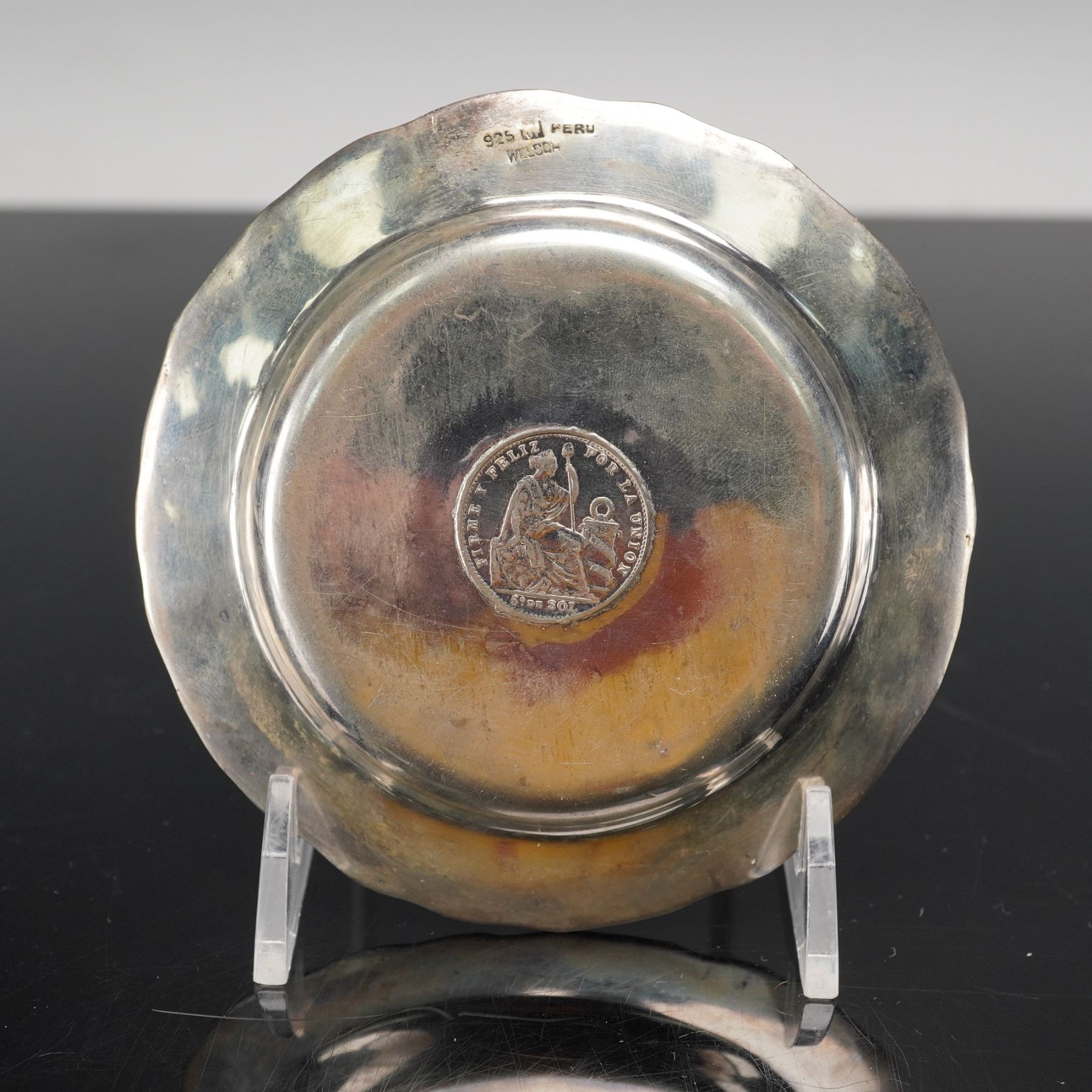 This elegant sterling silver caviar dish features a gently scalloped rim and a central inlaid Peruvian coin dated 1908, adding historical and cultural distinction to its refined form. Expertly crafted in Peru, the dish bears the marks "925 LW PERU" and "WELSCH," identifying it as a fine creation by the silversmith Welsch. A beautiful example of Peruvian silver artistry, it combines craftsmanship with numismatic appeal in a timeless decorative piece. The net silver of this dish is 2.116ozt.