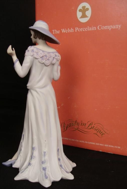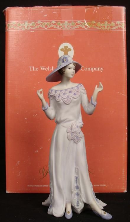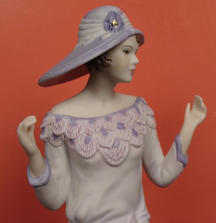 Here is Sally, donned in a playful pale lilac gown and hat, styled after the 1920's. This figurine is part of the Charleston Collection, highlighting the fashions of the young flapper girls. She was hand crafted and painted in the UK in all bisque, with matte finish, and touches of 22K gilt. * Maker: Welsh Porcelain Company Condition: Mint in the original box Size: 8 1/2 inches tall.