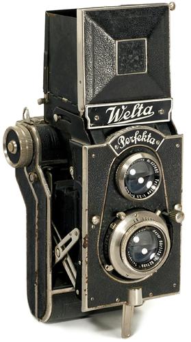 "Welta Perfekta", 1934 Welta Kamerawerk, Freital, TLR 6 x 6 cm, Compur shutter 1-1/300 sec., with Trioplan 3,5/7,5 cm, uncommon TLR camera!<Br>