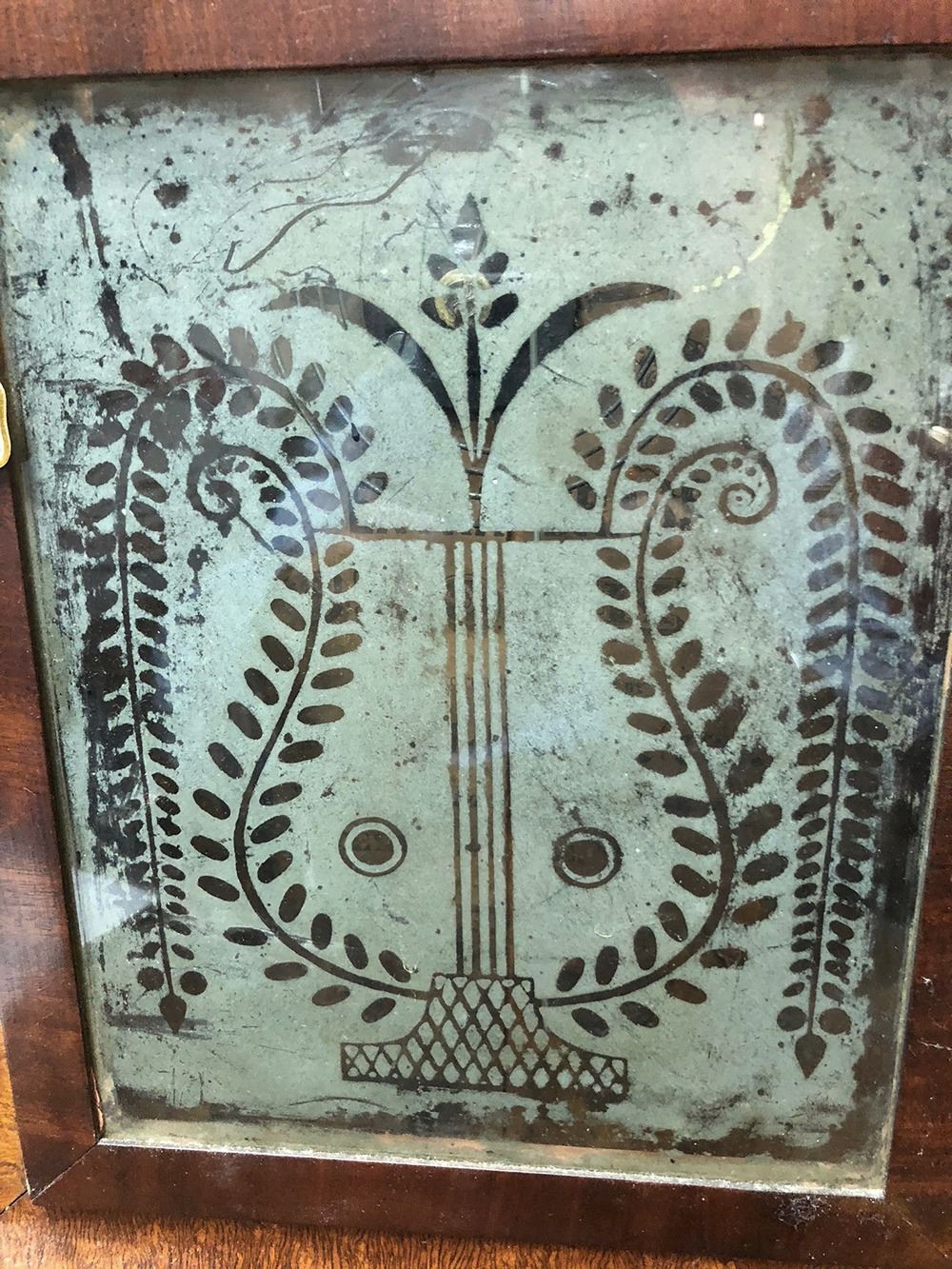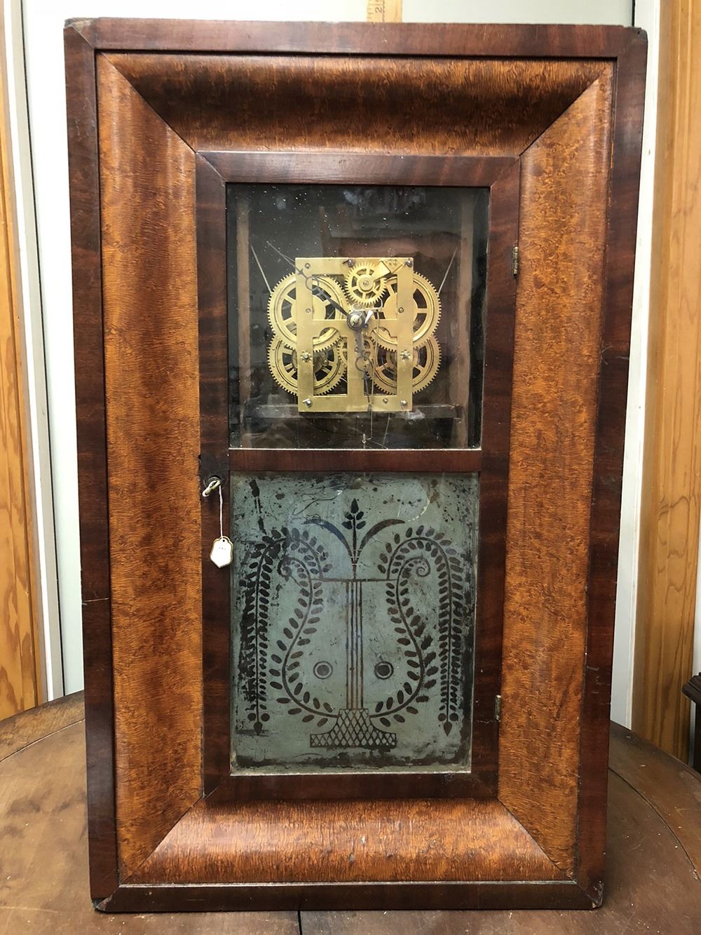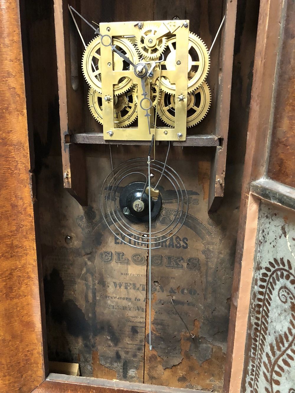Welton & Co., Terryville, CT OG Shelf Clock. Tiger birdseye maple moulding, lyre motif on glass, with weights, needs dial.