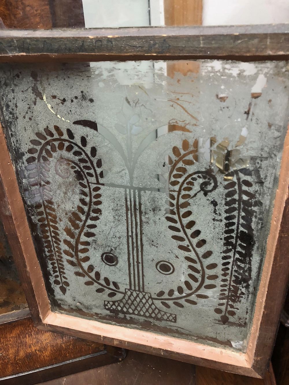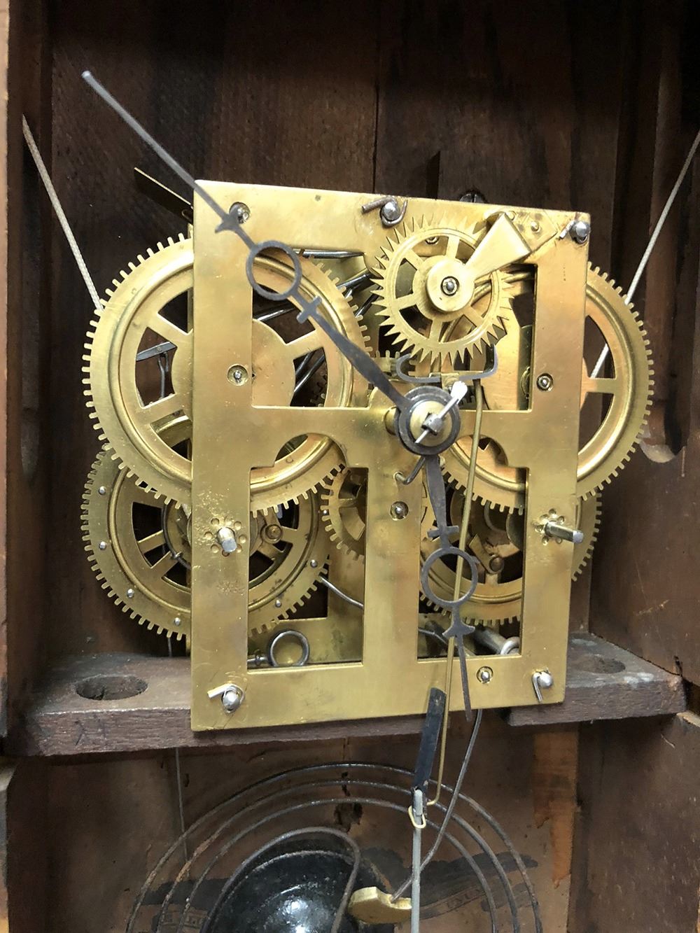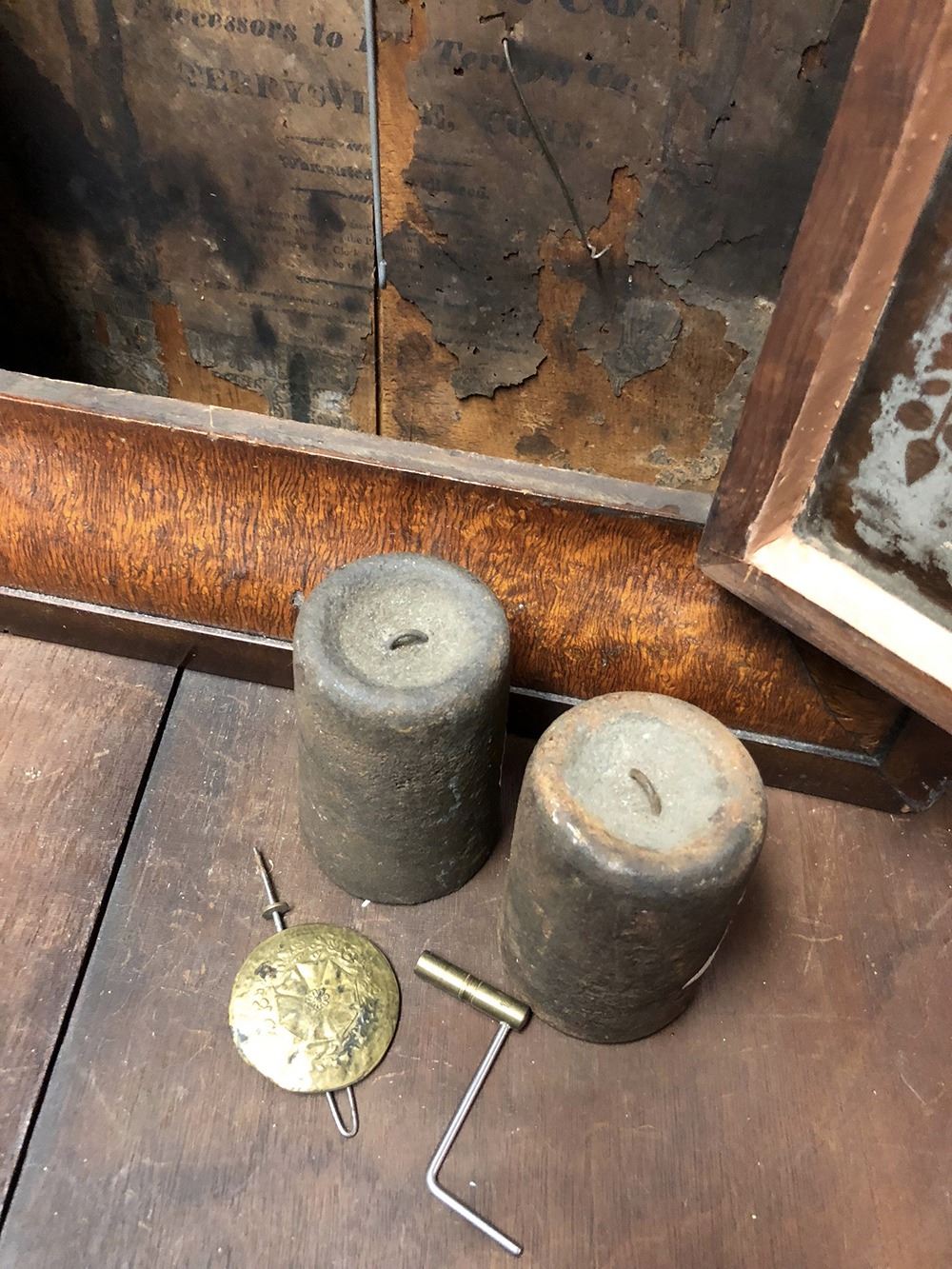 Welton & Co., Terryville, CT OG Shelf Clock. Tiger birdseye maple moulding, lyre motif on glass, with weights, needs dial.