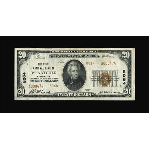 <B>Wenatchee, WA</B></I> - $20 1929 Ty. 2 <B>The First NB</B></I> Ch. # 8064<BR> This pleasing <B>Very Fine</B></I> example is a new addition to the census on this bank with numerous serial number one notes to its credit. Bright with some embossing remaining.<BR><I>From The Walla Walla Collection</B></I><BR><BR><b>Shipping:</b> Coins & Currency (<a target="_blank" href="http://www.heritageauctions.com/common/shipping.php">view shipping information</a>)