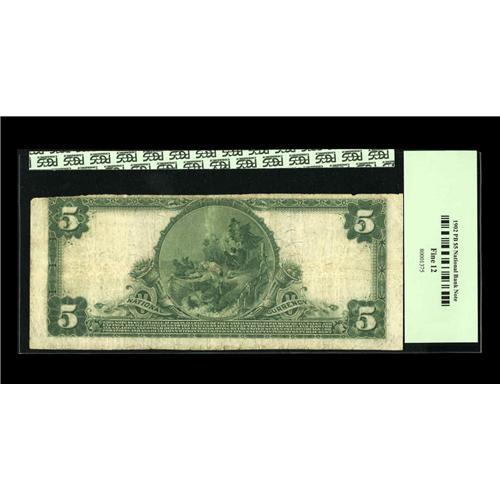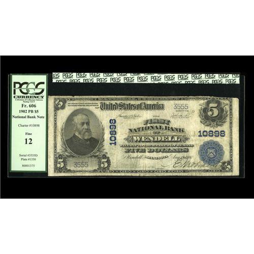 <B>Wendell, MN</B></I> - $5 1902 Plain Back Fr. 606 <B>The First NB</B></I> Ch. # 10898<BR>One signature is quite strong and the other on the weak side on this scarce note from an elusive issuer that was the only federally chartered bank in this small western Minnesota community. In its 16 year run prior to falling victim to the Great Depression in 1932, its large issue extended only to the $5 and $10 Plain Backs. It's total printing was a relatively small $238,620, of which only $1,820 in large remained in circulation when it closed its doors. This <B>PCGS Fine 12</B></I> is scarce enough that bidding will reach a minimum range of...