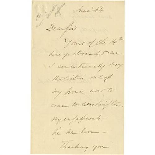 <B>Wendell Phillips Autograph Letter Signed,</B></I> 2 pages, 4.5", 7.25", June 1864, to a "<I>S Wolf Esq</B></I>". A brief letter declining an invitation and closing "<I>Faithfully in opposition to A.L. </B></I> Abraham Lincoln ". Near fine condition. <I>From the collection of Henry E. Luhrs.</B></I><BR><BR><b>Shipping:</b> Miscellaneous Collectibles, Smal (<a target="_blank" href="http://www.heritageauctions.com/common/shipping.php">view shipping information</a>)