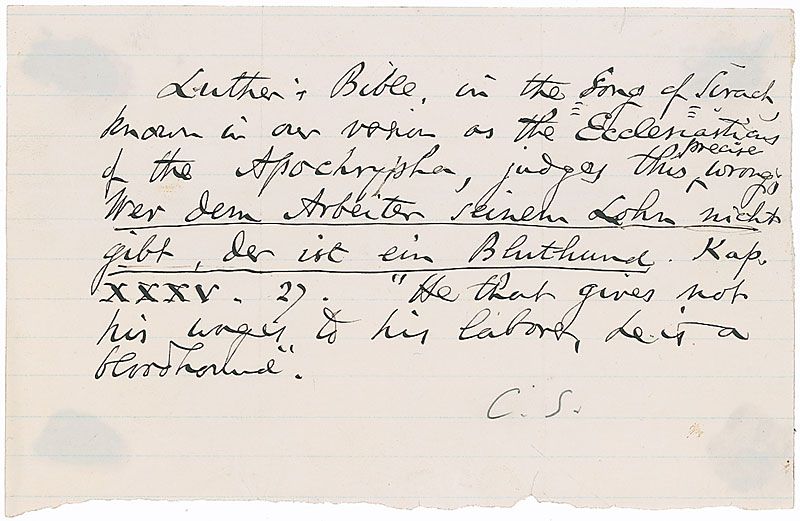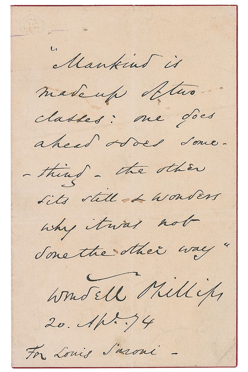 Two AQSs: one AQS signed “Wendell Phillips,” one page, 3.75 x 6, April 20, 1874, in part: “Mankind is made up of two classes: one goes ahead & does something—the other sits still & wonders why it was not some other way”; and an unsigned AQS by Charles Sumner, one lightly-lined lined page, 7.5 x 4.75, no date, in part: “He that gives not his wages to his laborer, he is a bloodhound.” In overall fine condition, with intersecting folds to both.