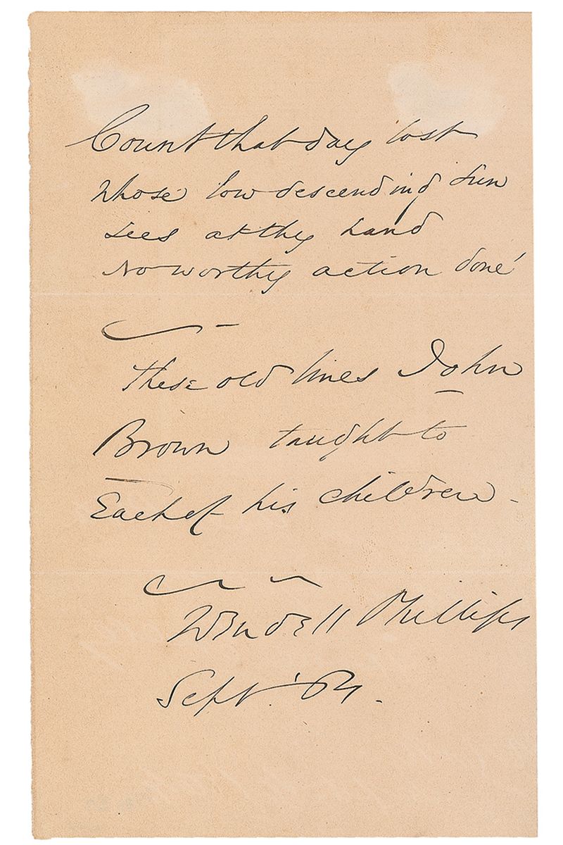 AQS on an off-white 4.25 x 7.25 sheet. Phillips writes, “Count that day lost whose low descending sun, Lies at thy hand no worthy action done. These old lines John Brown taught to each of his children.” Signed at the bottom, “Wendell Phillips, Sept ‘64.” Uniform toning, and two circular areas of discoloration near top from mounting remnants on reverse, otherwise fine condition.