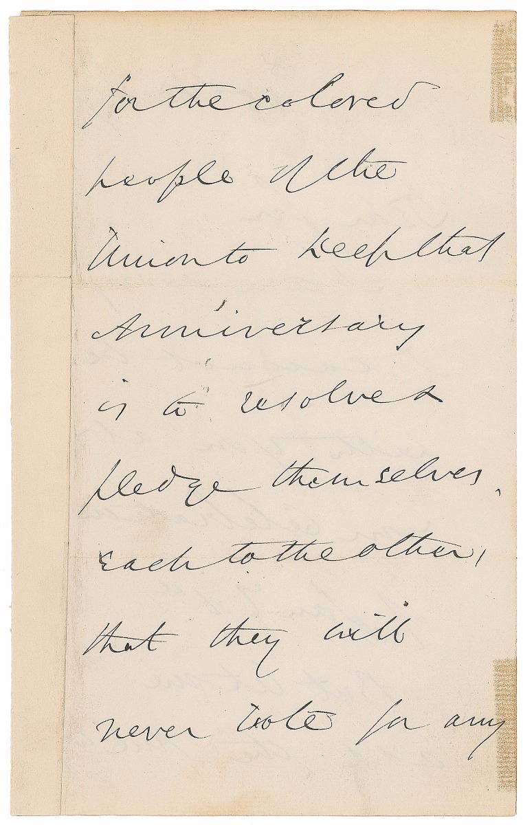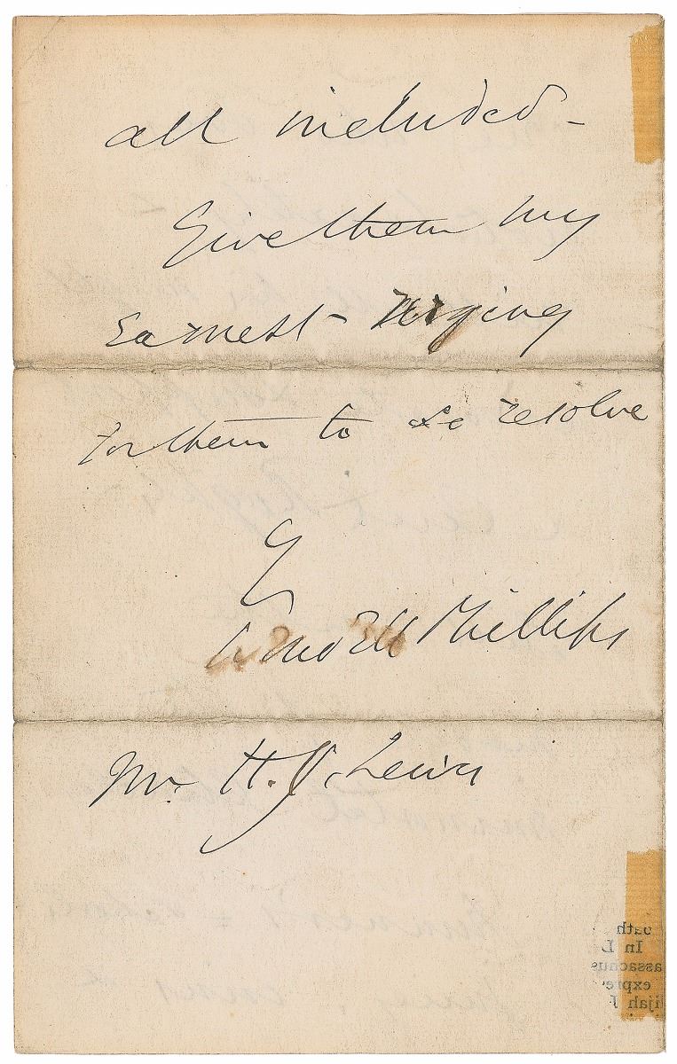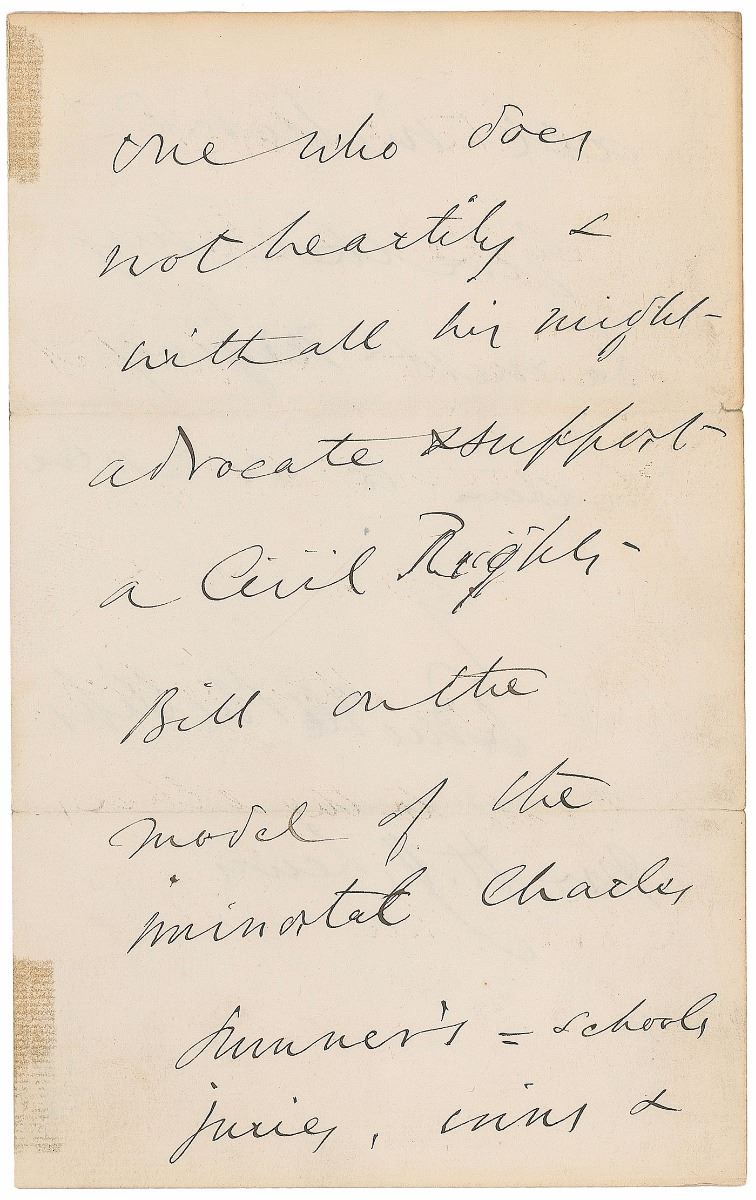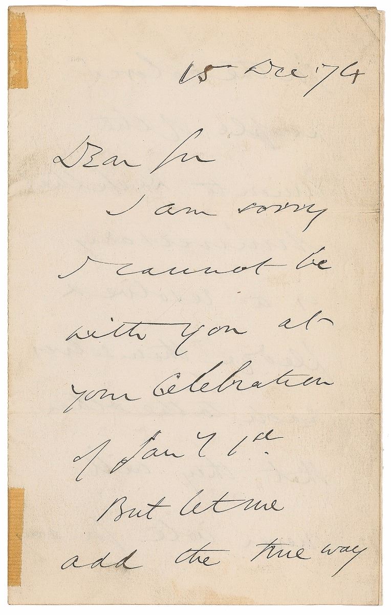 American abolitionist, eloquent orator, and social reformer (1811–1884). ALS, four pages on two adjoining sheets, 5 x 8, December 15, 1874. Letter to H. G. Lewis, in part: “I am sorry I cannot be with you at your celebration…But let me add the true way for the colored people of the Union to keep that anniversary is to resolve & pledge themselves, each to the other, that they will never vote for any one who does not heartily & with all his might advocate & support a Civil Rights Bill on the model of the immortal Charles Sumner.” In very good condition, with scattered soiling (affecting first name of signature), toned tape to partially separated spine, and a mounting strip along inside edge of first page.