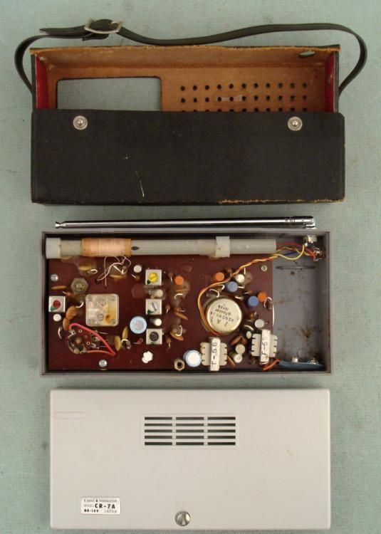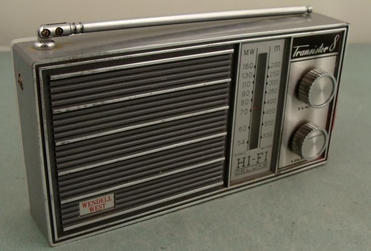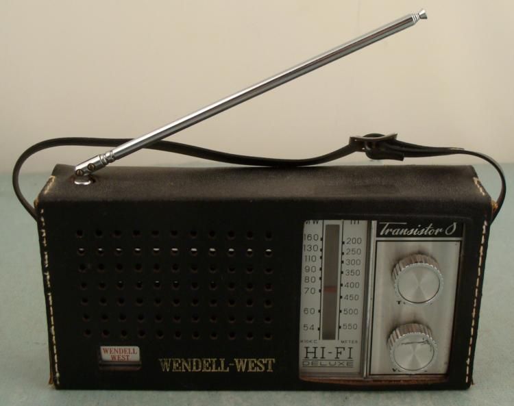 Here is a Wendell-West model CR-7A Hi-Fi Deluxe 8 Transistor Portable Radio made in 1968. It needs a new 9 volt battery connector, so it has not been tested, but overall it looks to be in very good condition. The body is gray with chrome tone, tuning knobs and face plates. There is a black leather cover with strap for carrying, with portion separated in back, but fine in front. It has X10KC and meter. The dimensions are 1 3/4 x 3 1/2" x 7 1/2". * This Wendell-West radio is a stylish transistor for your collection.