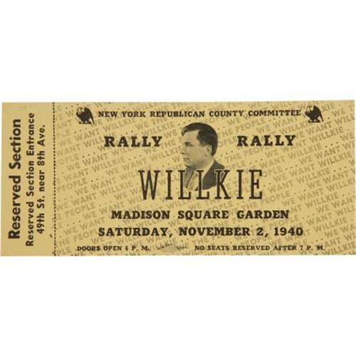 <B>Wendell Willkie Presidential Campaign Rally Ticket,</B></I> November 2, 1940, 5 x 2 . Very fine. <BR><BR><b>Shipping:</b> Flat Material, Small (<a target="_blank" href="http://www.heritageauctions.com/common/shipping.php">view shipping information</a>)