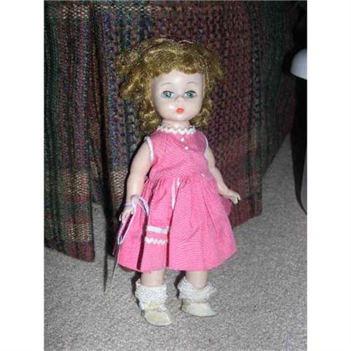 This is an 8" Madame Alexander doll made in the 1950's. She is called a bent-knee walker but her head doesn't turn when you move her legs if it's suppose to. She has open and close eyes. She has a cuted pink dress tagged Wendy-kin. She has white panties that I think are Vogue as they have the white loopy trim. She has socks and side snap shoes. Her dress and shoes are shoes are nice. The soles are fuzzy. She needs alittle TLC with her hair but I'm sure she can look great. She is marked on the back, Alex. She is from a smoke free environment. Buyer to pay $10 for shipping, insurance and handling. Thanks for viewing.
