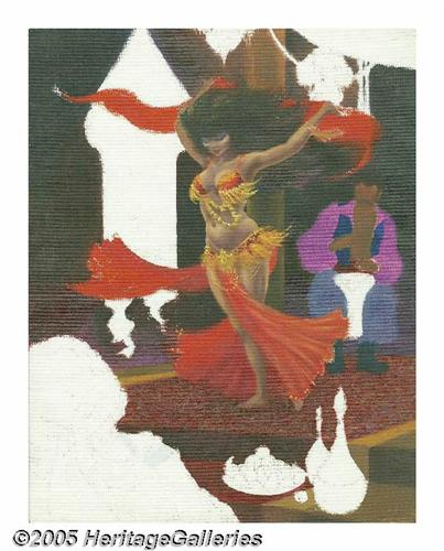 <B>Wendy Pini - Unfinished Bellydancer Painting Original Art (undated).</B></I> This sensual swirl of paint and color by Wendy Pini is sure to make your pulse speed up! Pini left areas of this spicy sensation unfinished, which lets you see a bit of her working process. Painted on a 12" x 15" sheet of canvas board, the art is in Excellent condition and signed by Wendy Pini at the lower right.
