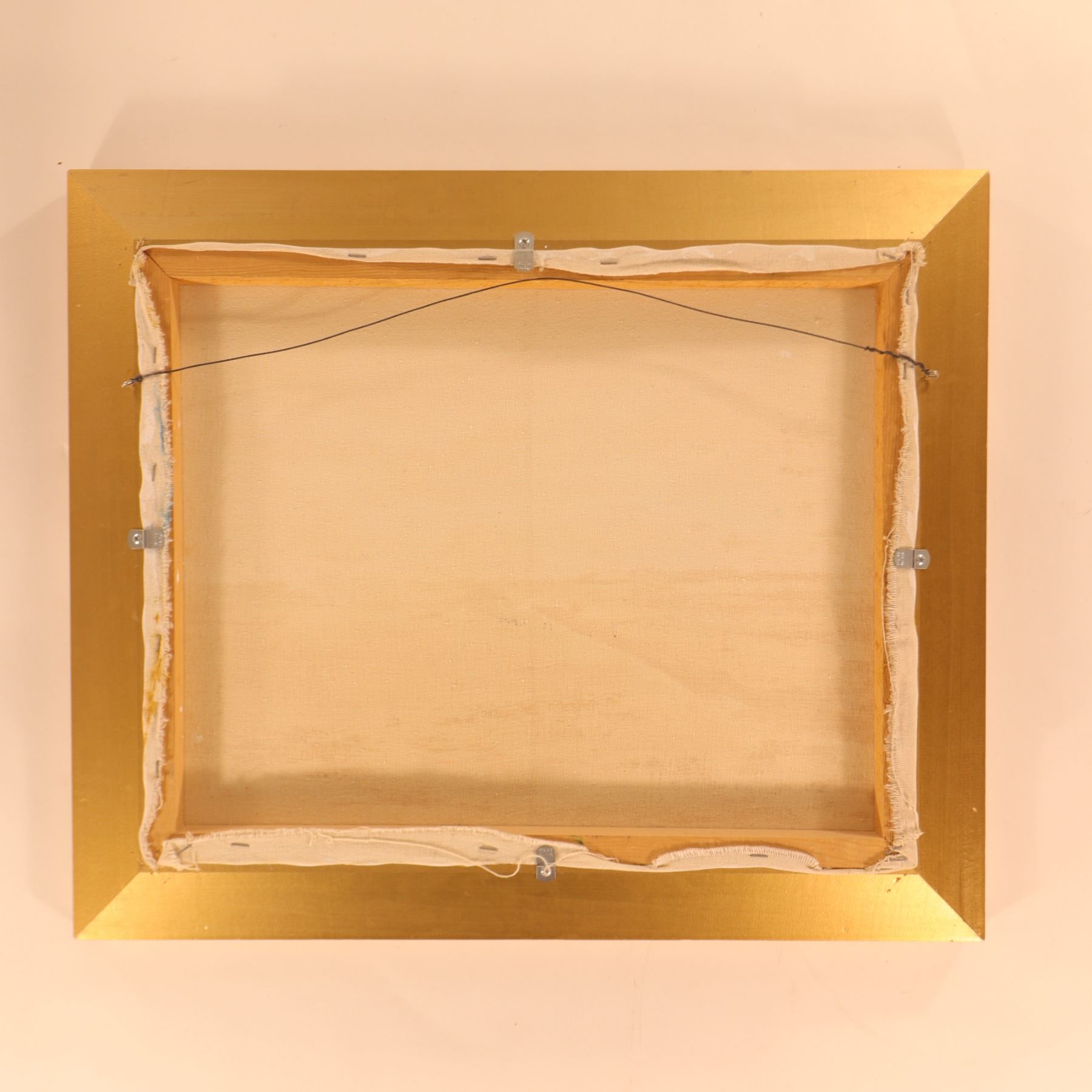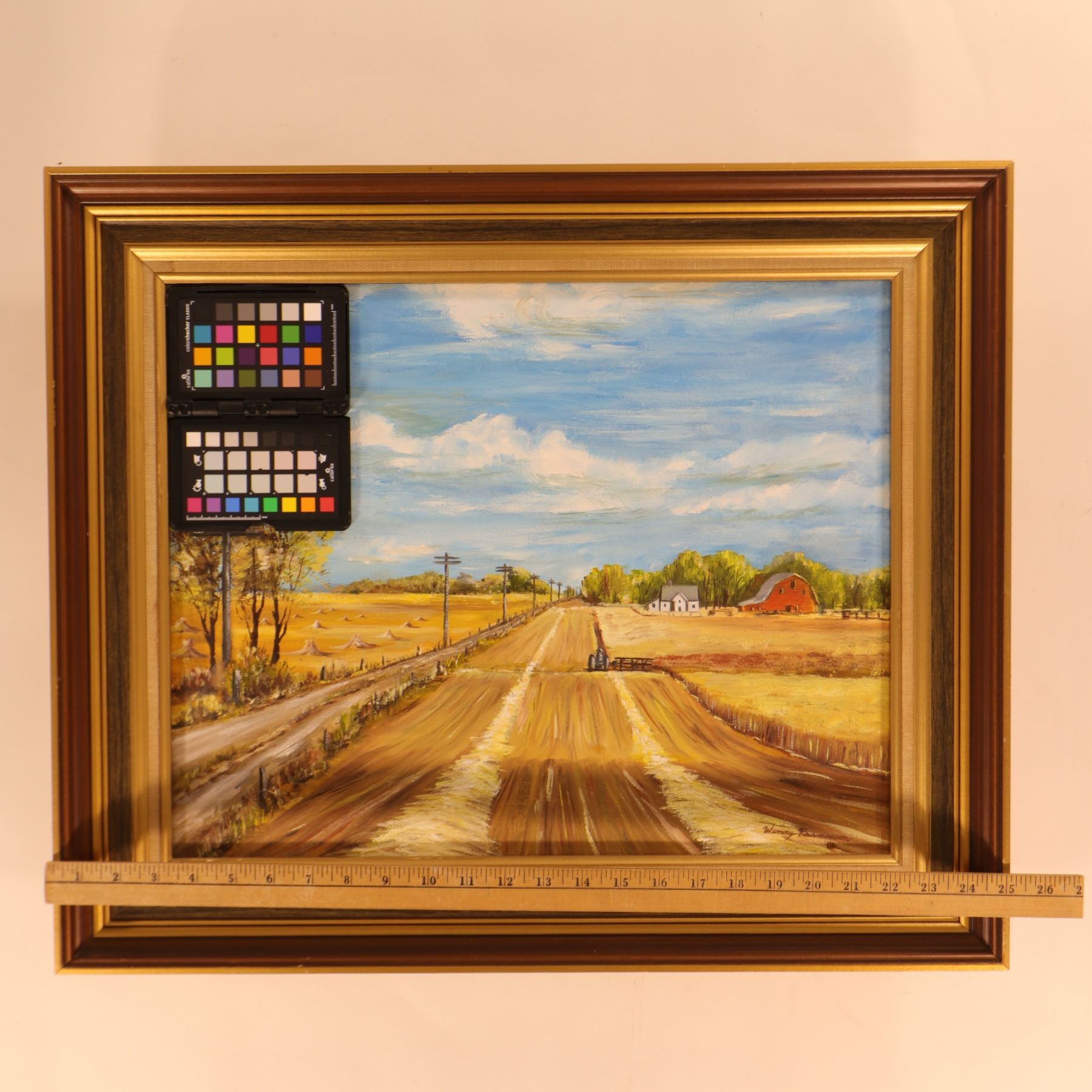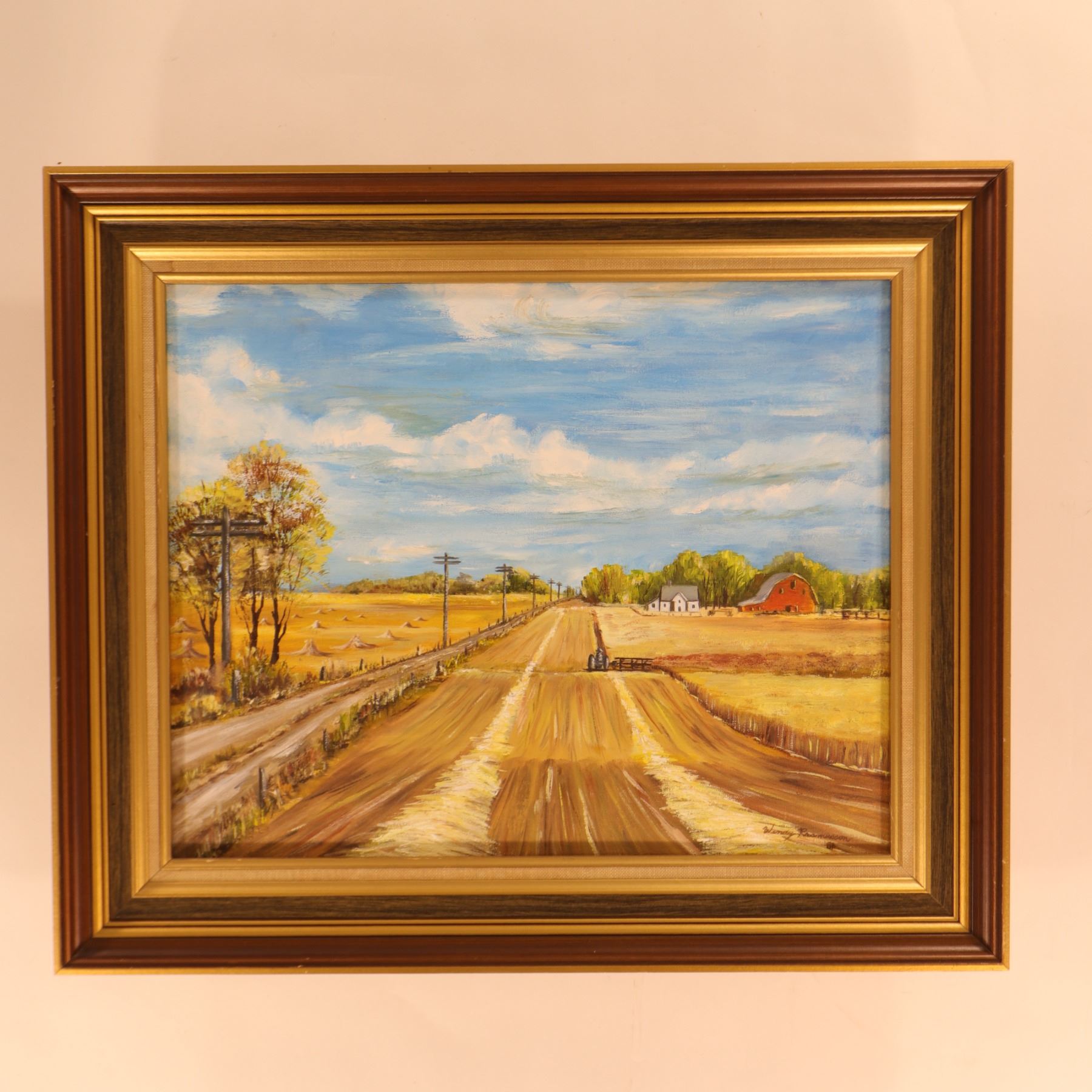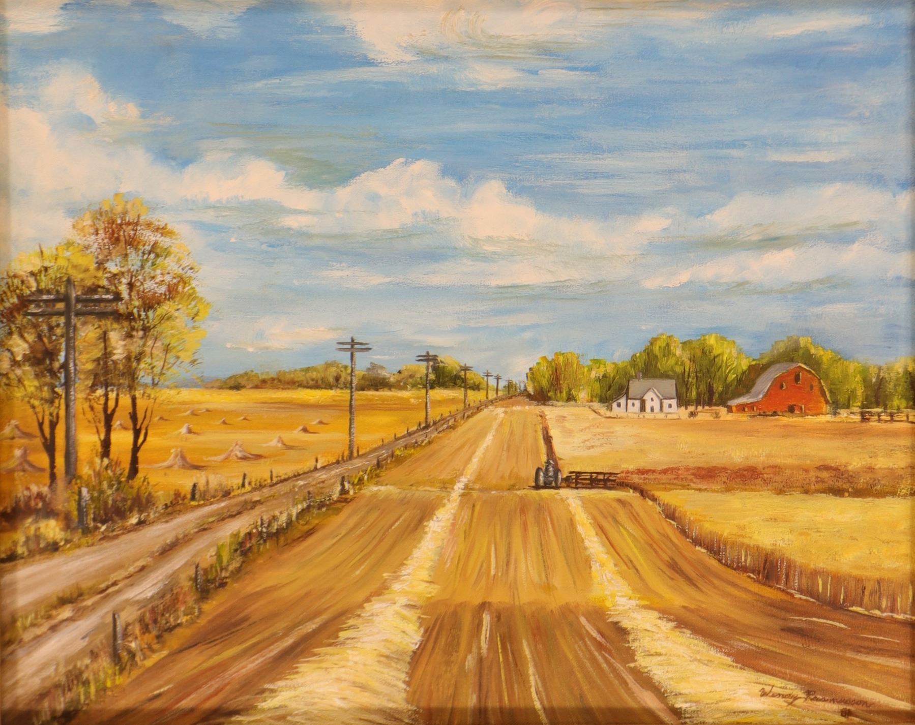 Signed and dated 1981 lower left, this landscape painting depicts a long country road receding toward a prairie homestead, with telephone poles, open harvested fields, haystacks, and a small working farmstead set under a broad blue sky. The composition is built around strong linear perspective, drawing the eye down the rutted road toward the distant buildings and giving the scene a distinctly rural Western Canadian character. Warm ochres, golds, and earth tones dominate the foreground and fields, contrasted by cooler blues in the sky and softer greens around the farm. The painting has a straightforward, nostalgic appeal, capturing the quiet openness of the countryside and the order of an agricultural landscape. Signed lower left Wendy Rasmusson ’81. Oil on canvas. Painting 20 x 16 in.; framed 25 x 21 in.