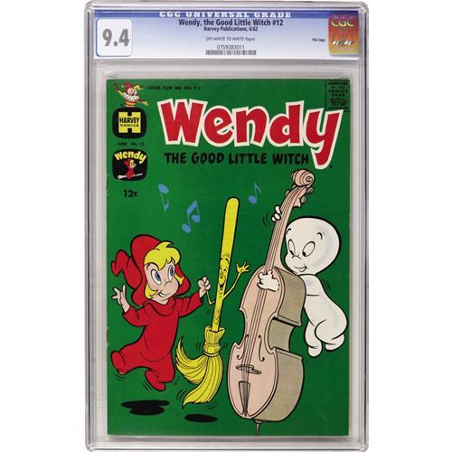 <B>Wendy, the Good Little Witch #12 File Copy (Harvey, 1962) CGC NM 9.4 Off-white to white pages.</B></I> If you're paying attention (check out the lots immediately before and after this one), you could wind up with a bevy of highest-graded copies of this title. Overstreet 2006 NM- 9.2 value = $65. CGC census 3/07: 1 in 9.4, none higher. <I> From the Cary and Cheryl Porter Collection.</B></I><BR><BR><b>Shipping:</b> Comics - Slabbed (certified) (<a target="_blank" href="http://www.heritageauctions.com/common/shipping.php">view shipping information</a>)
