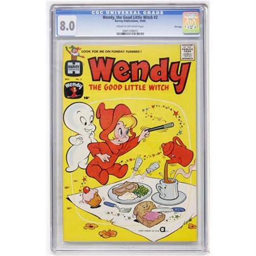 <B>Wendy, the Good Little Witch #2 File Copy (Harvey, 1960) CGC VF 8.0 Cream to off-white pages.</B></I> Casper cover appearance. Overstreet 2007 VF 8.0 value = $90. CGC census 1/08: 1 in 8.0, 5 higher.<BR><BR><b>Shipping:</b> Comics - Slabbed (certified) (<a target="_blank" href="http://www.heritageauctions.com/common/shipping.php">view shipping information</a>)