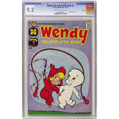 <B>Wendy, the Good Little Witch #3 File Copy (Harvey, 1960) CGC NM- 9.2, Cream to off-white pages.</B></I> Casper joins Wendy for a "spell" of exercise on the cover, and a Spooky backup is included. Overstreet 2006 NM- 9.2 value = $135. CGC census 3/07: 2 in 9.2, none higher. <I> From the Cary and Cheryl Porter Collection.</B></I><BR><BR><b>Shipping:</b> Comics - Slabbed (certified) (<a target="_blank" href="http://www.heritageauctions.com/common/shipping.php">view shipping information</a>)